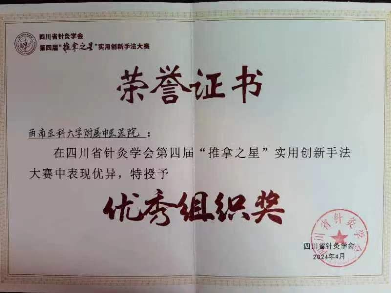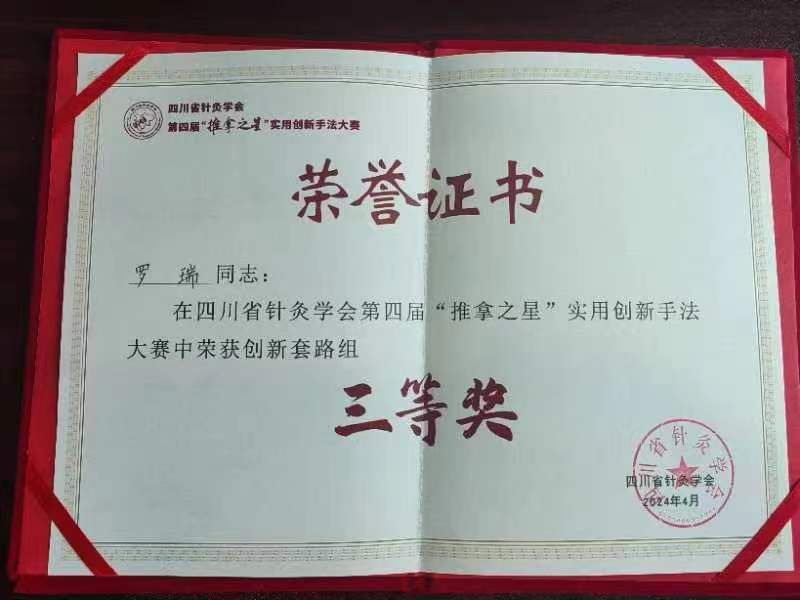 4月20日,四川省推拿学会第四届“推拿之星”实用创新手法大赛在成都举行,150余名来自川渝地区医疗机构的推拿英才参加了比赛。经过角逐,针灸·推拿·康复科医生罗瑞荣获铜手指奖,我院荣获优秀组织奖。