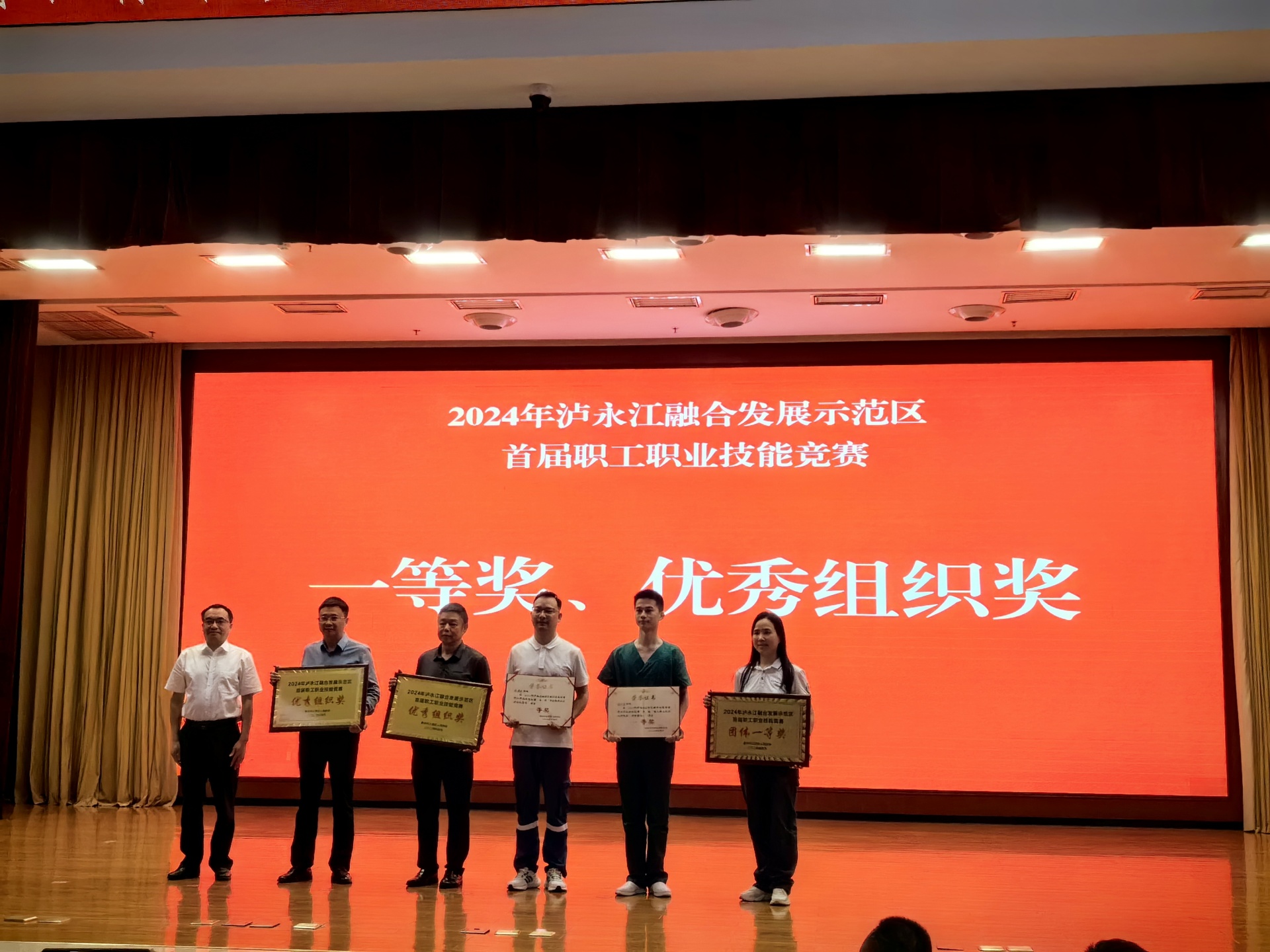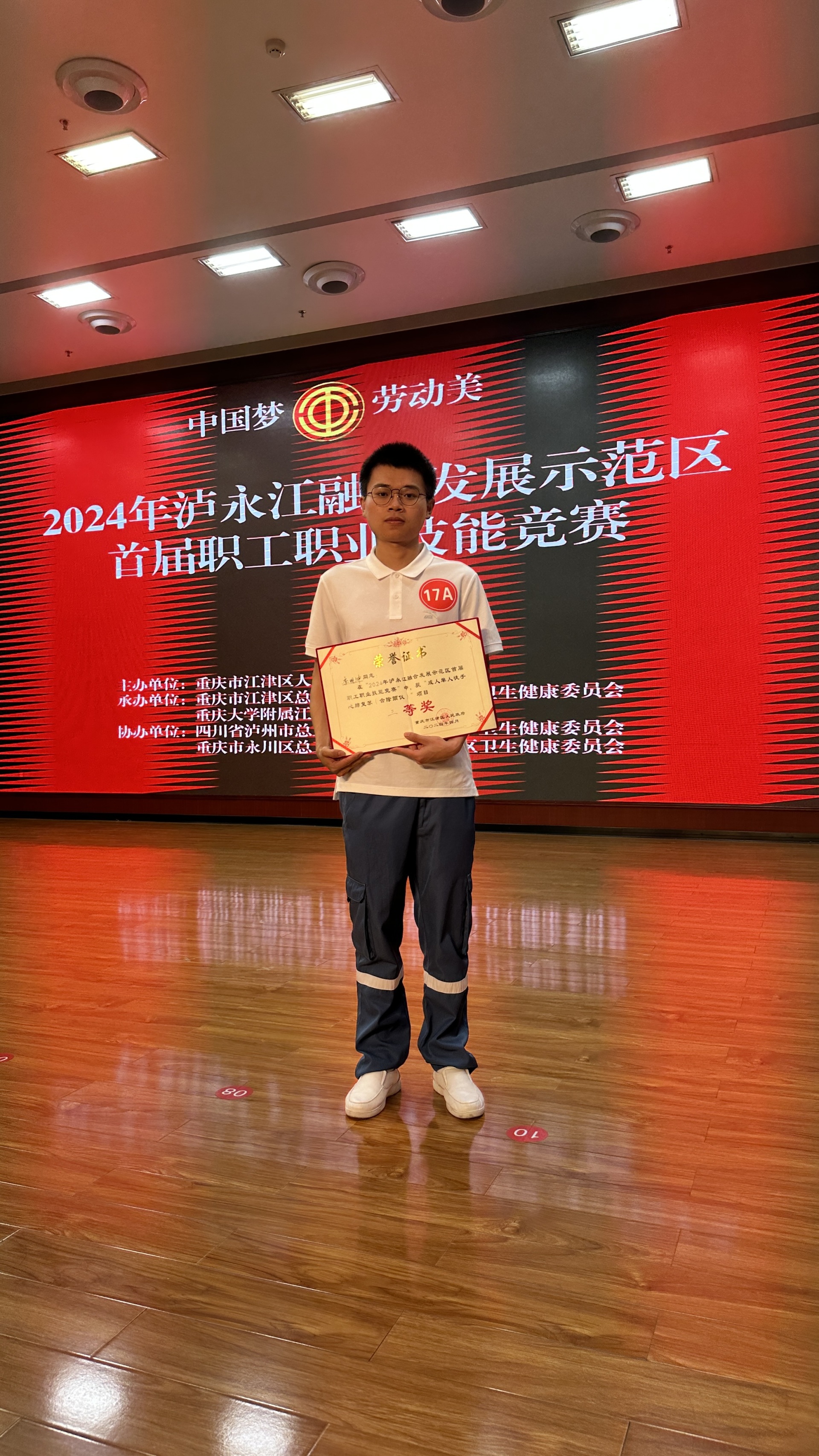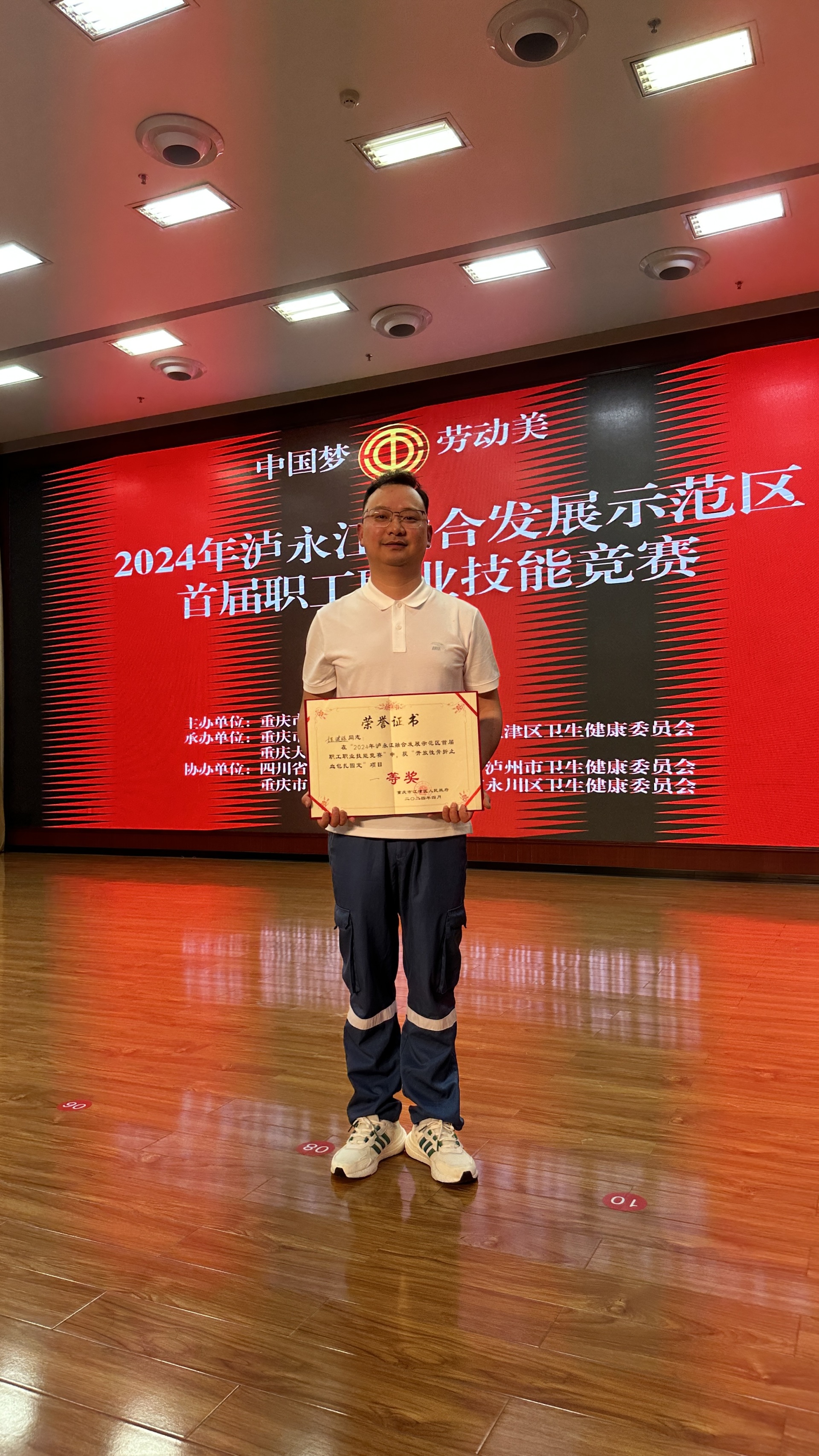 4月28-29日,2024年泸永江融合发展示范区首届职工职业技能竞赛暨江津区庆祝“五一”国际劳动节活动在重庆举行,我院城北急诊科程健强、李明坤代表医院参赛并荣获团体二等奖;在单人项目中,程建强荣获“开放性骨折止血包扎固定”项目一等奖,李明坤荣获“成人单人徒手心肺复苏(含除颤仪)”项目三等奖。