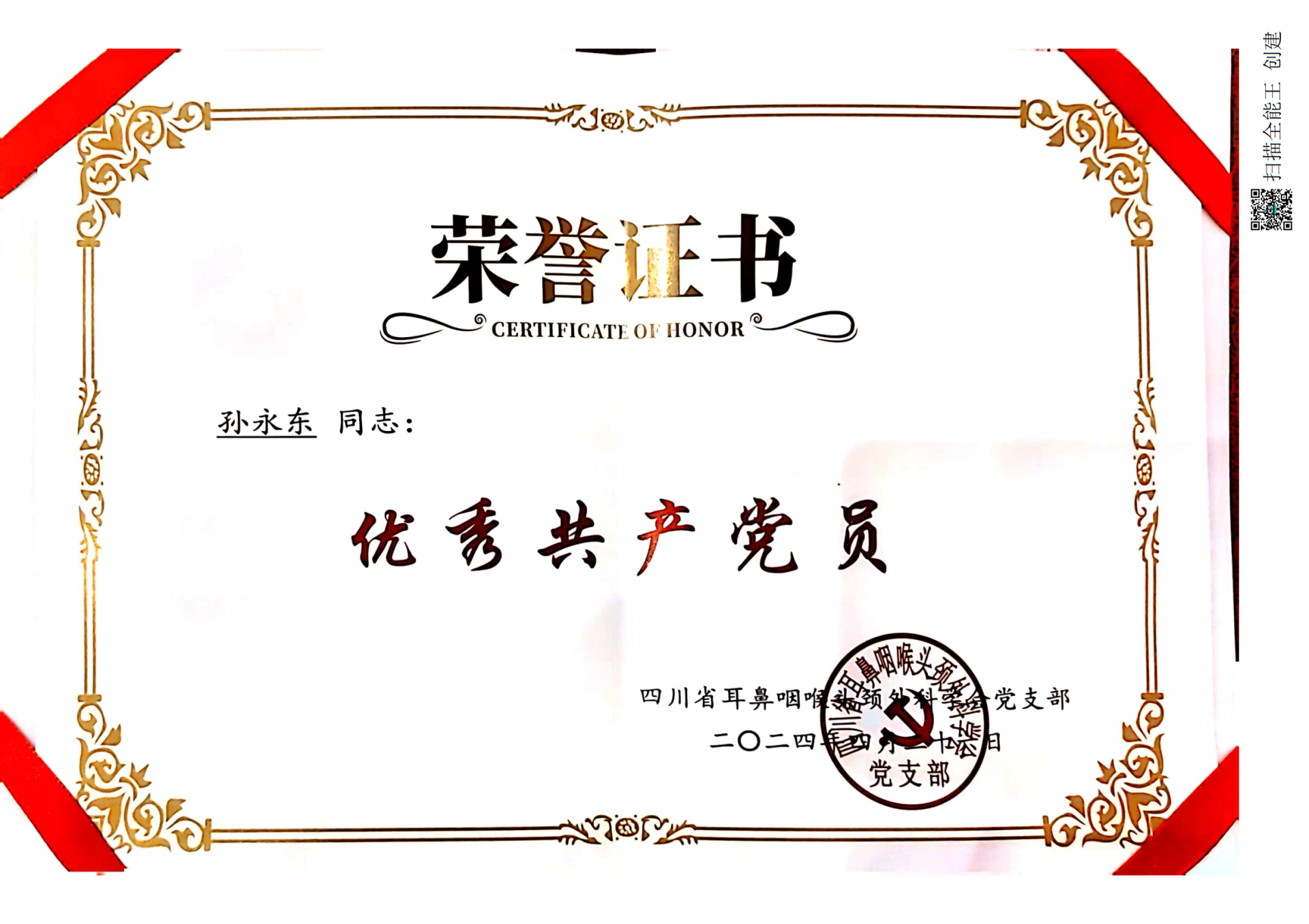 4月26日,四川省耳鼻咽喉头颈外科学会第二届理事会第四次会议在成都召开,会议对学会优秀党员 、标兵专委会、先进个人等进行了颁奖,我院耳鼻咽喉科学科主任孙永东教授荣获四川省耳鼻咽喉头颈外科学会党支部优秀共产党员。