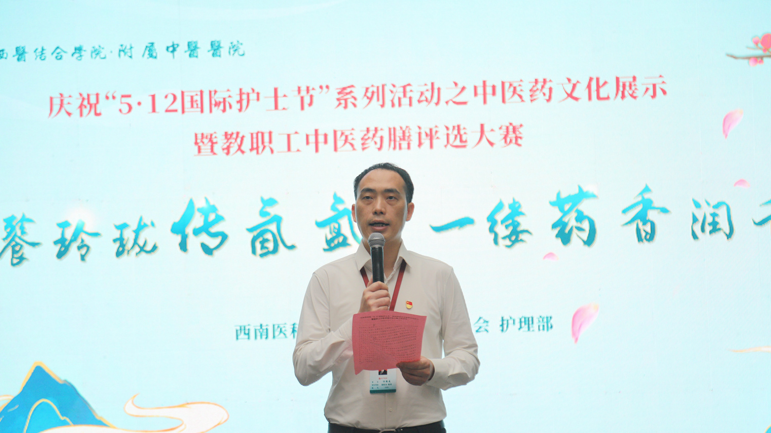 汪国友讲话,他向全体护理同仁表达了节日的问候,指出本次活动旨在共同感受“药食同源、医食同功”的文化精髓,进一步弘扬中医养生、以食疗疾的饮食养生理念,创新打造现代化药膳文化。他表示医院将继续坚持“让中医文化扬起来,让经典名方活起来,让中药香味飘起来,让中医技术用起来”的中医药发展理念,进一步挖掘、传承、弘扬中医瑰宝,培养广大老百姓关注中医药、信任中医药、使用中医药的健康理念,助力“新康养”产业,为推进泸州市区域医药健康中心建设、四川省中医药强省、中医综合改革示范区建设及健康中国建设贡献力量。