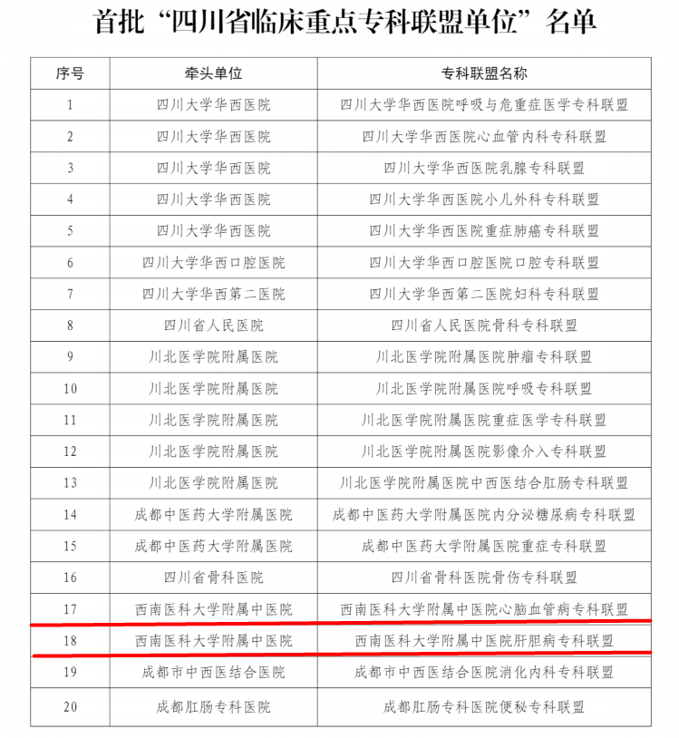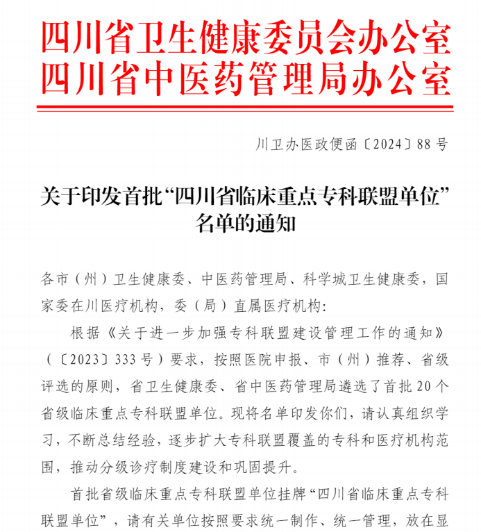 近日,四川省卫生健康委员会、四川省中医药管理局联合公布《关于印发首批“四川省临床重点专科联盟单位”名单的通知》,我院的心脑血管病、肝胆病专科联盟上榜,成为首批被认定的“四川省临床重点专科联盟单位”。