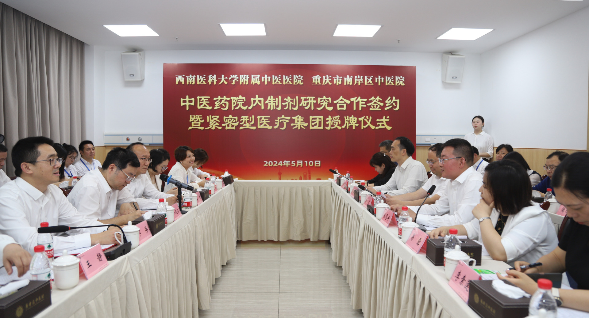 揭牌仪式结束后,由邓伟主持召开了座谈会,重庆市南岸区卫生健康委、南岸区中医院及我院相关人员参加了会议。会上,邓伟介绍了南岸区中医院的基本情况及合作需求,双方就合作事宜进行了交流。