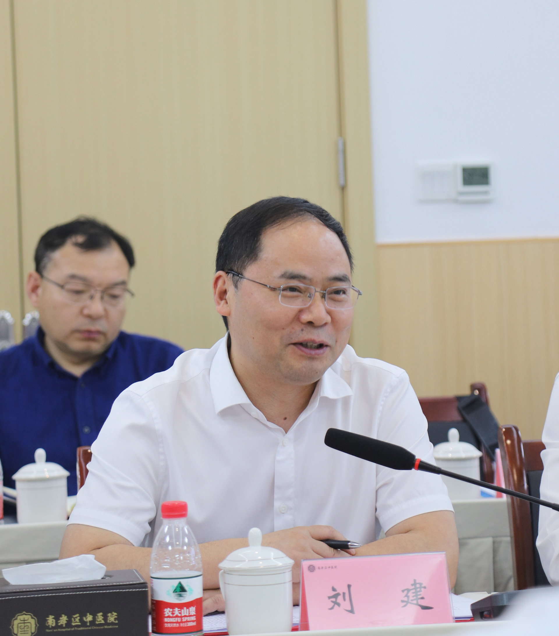 刘建讲话,他肯定了南岸区中医院取得的成绩,介绍了我院的发展历程和基本情况。他希望双方在公立医院绩效考核、中医药院内制剂研发、等级医院评审等方面加强交流、相互借鉴,积极发挥中医药同根同源优势,推动川渝两地中医药事业、产业、文化一体化发展,为全面开创川渝中医药高质量发展新局面作出积极贡献,共同助力成渝双层经济圈建设。
