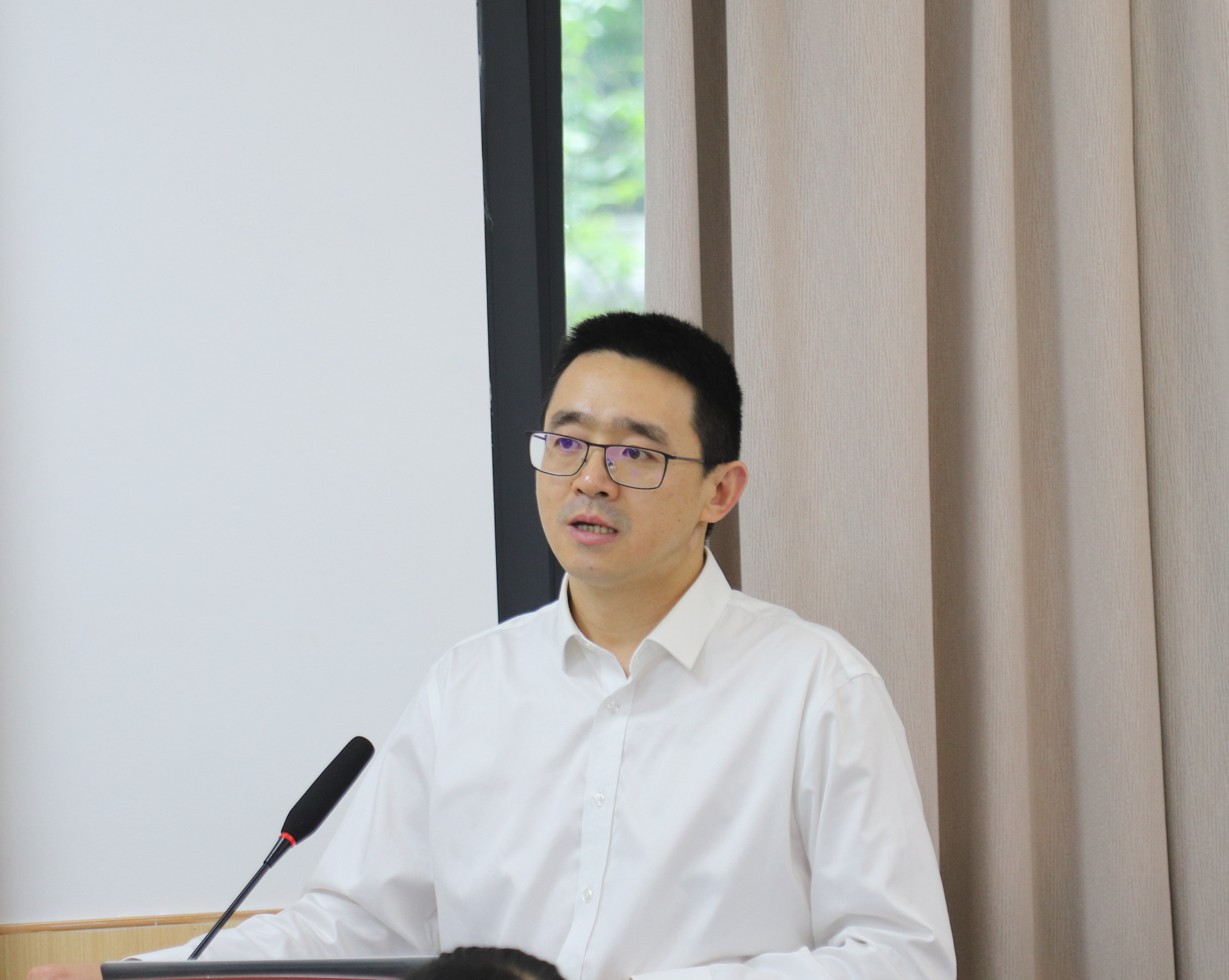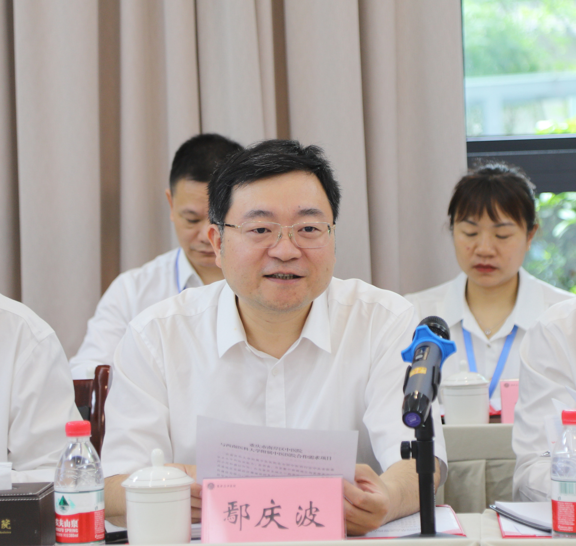 鄢庆波讲话。他指出,希望我院能够在医院精细化管理运营、学科建设、人才队伍建设、科研教学、等级医院创建、中医药院内制剂研发等方面帮扶南岸区中医院,并代表区卫生健康委表示将全力支持双方的合作。