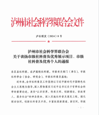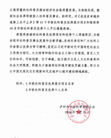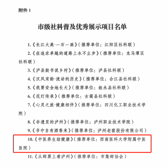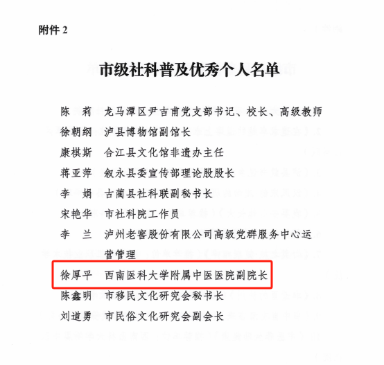 近日,泸州市社会科学界联合会发布了《关于表扬市级社科普及优秀展示项目、市级社科普及优秀个人的通报》。我院推荐的《中医养生助健康》项目获评市级社科普及优秀展示项目,副院长徐厚平获评市级社科普及优秀个人。