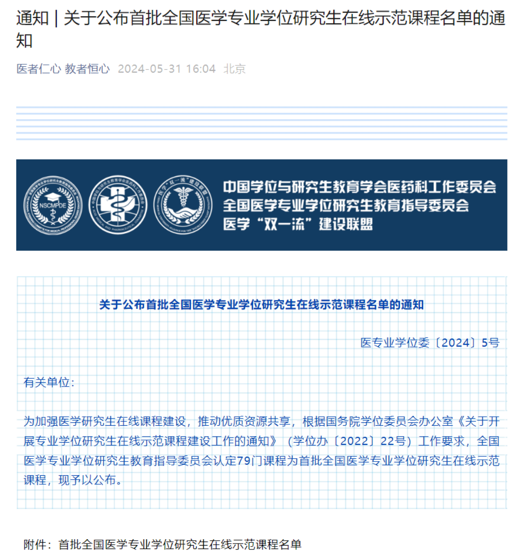 2024年5月30日,全国医学专业学位研究生教育指导委员会发布了《关于公布首批全国医学专业学位研究生在线示范课程名单的通知》,我院王丽教授团队录制的研究生线上课程《科学研究与设计概论》成功入选,是我校唯一入选的在线示范课程。