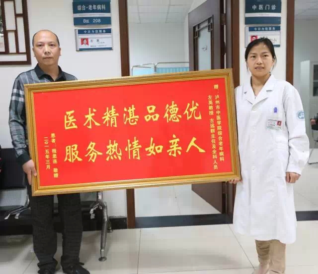 近日,我院综合•老年病科成功救治一名急性左心衰竭患者,为表示对全体医护人员的感谢,患者程思连家属特送来“医术精湛品德优 服务热情如亲人”的牌匾。