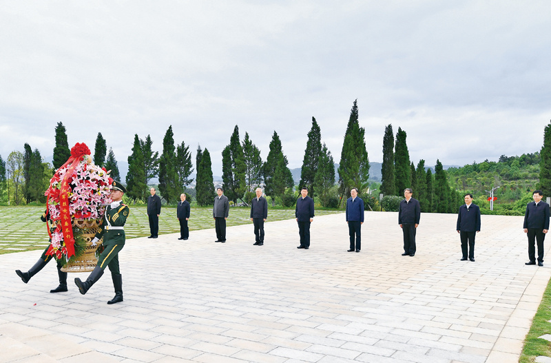 2021年4月25日至27日,中共中央总书记、国家主席、中央军委主席习近平在广西考察。这是25日上午,习近平在位于桂林市全州县的红军长征湘江战役纪念园,向湘江战役红军烈士敬献花篮。