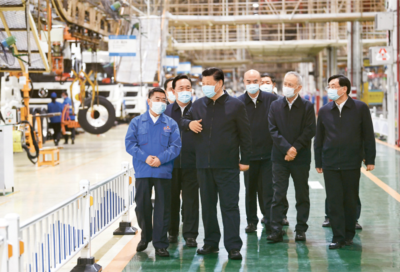 2020年4月20日至23日,中共中央总书记、国家主席、中央军委主席习近平在陕西考察。这是4月22日,习近平在陕西汽车控股集团有限公司总装车间察看生产线,了解产品研发、生产、销售和复工复产情况。