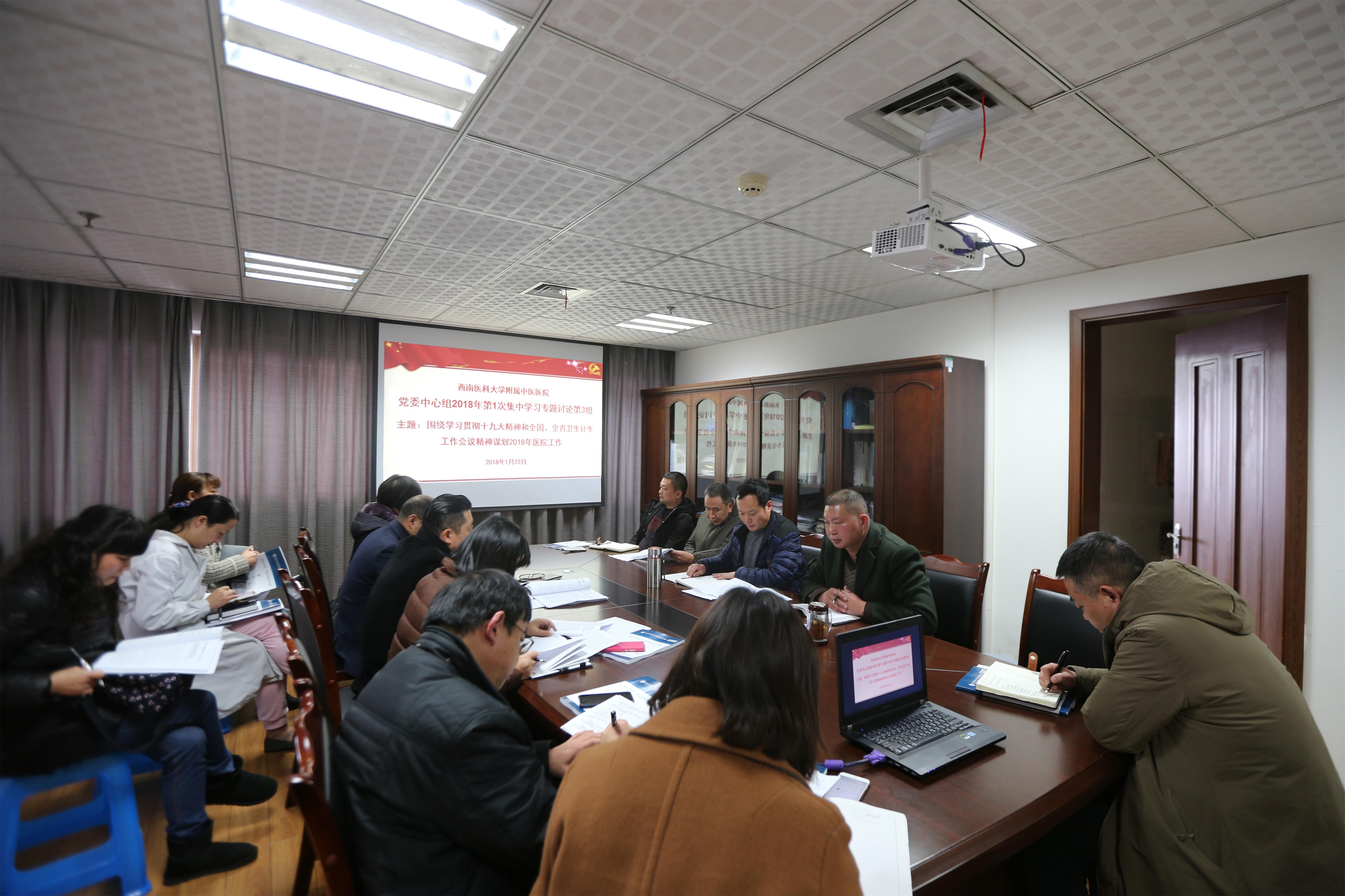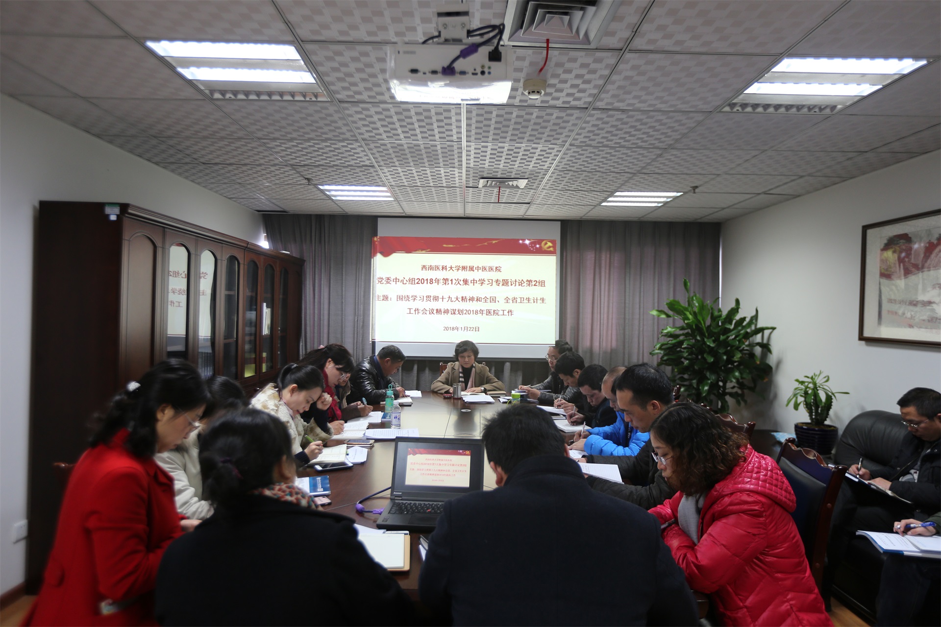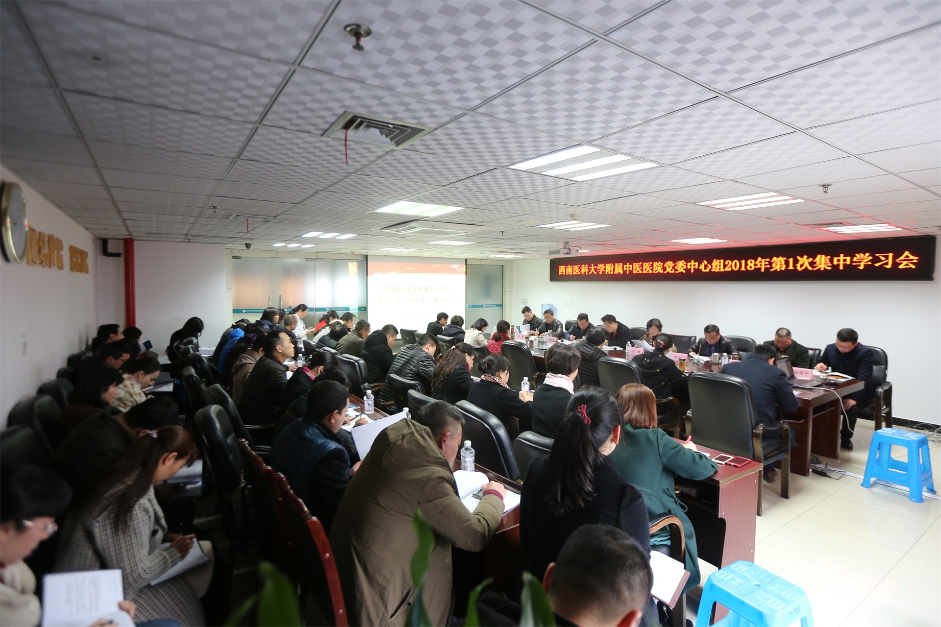 会议现场 2018年1月22日上午10点,我院在岐黄厅召开党委中心组2018年第1次集中学习会。全院处科级干部、党支部书记共计60余人参加了本次会议,会议由医院党委书记王琳主持。