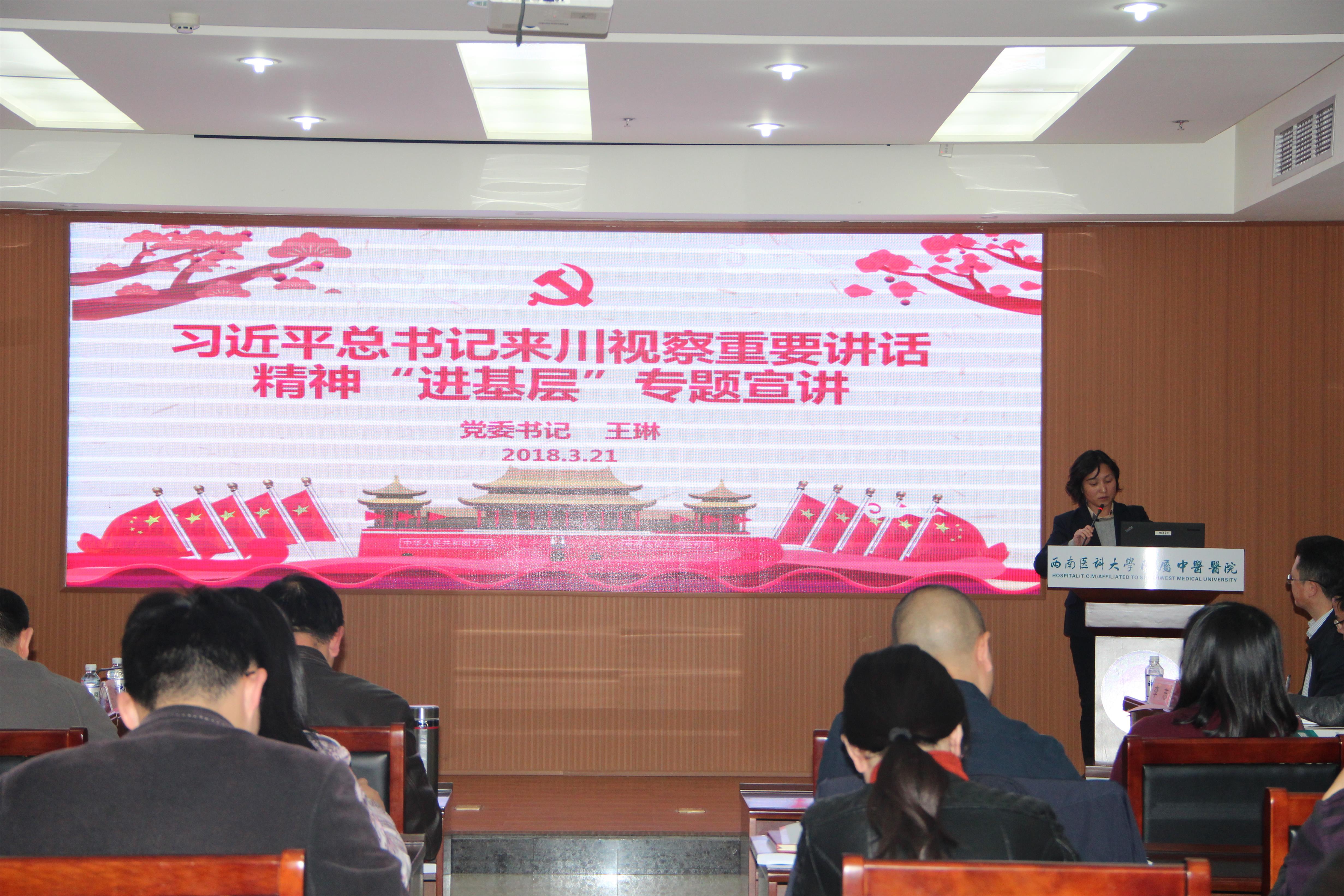 2018年3月21日,我院在第二住院大楼1号会议室召开了党委中心组2018年第2次集中学习会暨学习贯彻习近平总书记来川视察重要讲话精神“进基层”宣讲会,全体处科级干部,院值班人员,对口联络员、辅检科室主任、副主任及负责人共计120余人参加了本次会议。 会上,党委书记王琳从习近平总书记来川视察的基本情况、习近平总书记来川视察重要讲话精神以及省委省政府和学校党委关于学习贯彻讲话精神的相关要求等三个方面进行了宣讲,她还结合我院落实讲话精神、正在开展的医院党政工作、扶贫工作的相关情况进行了强调。