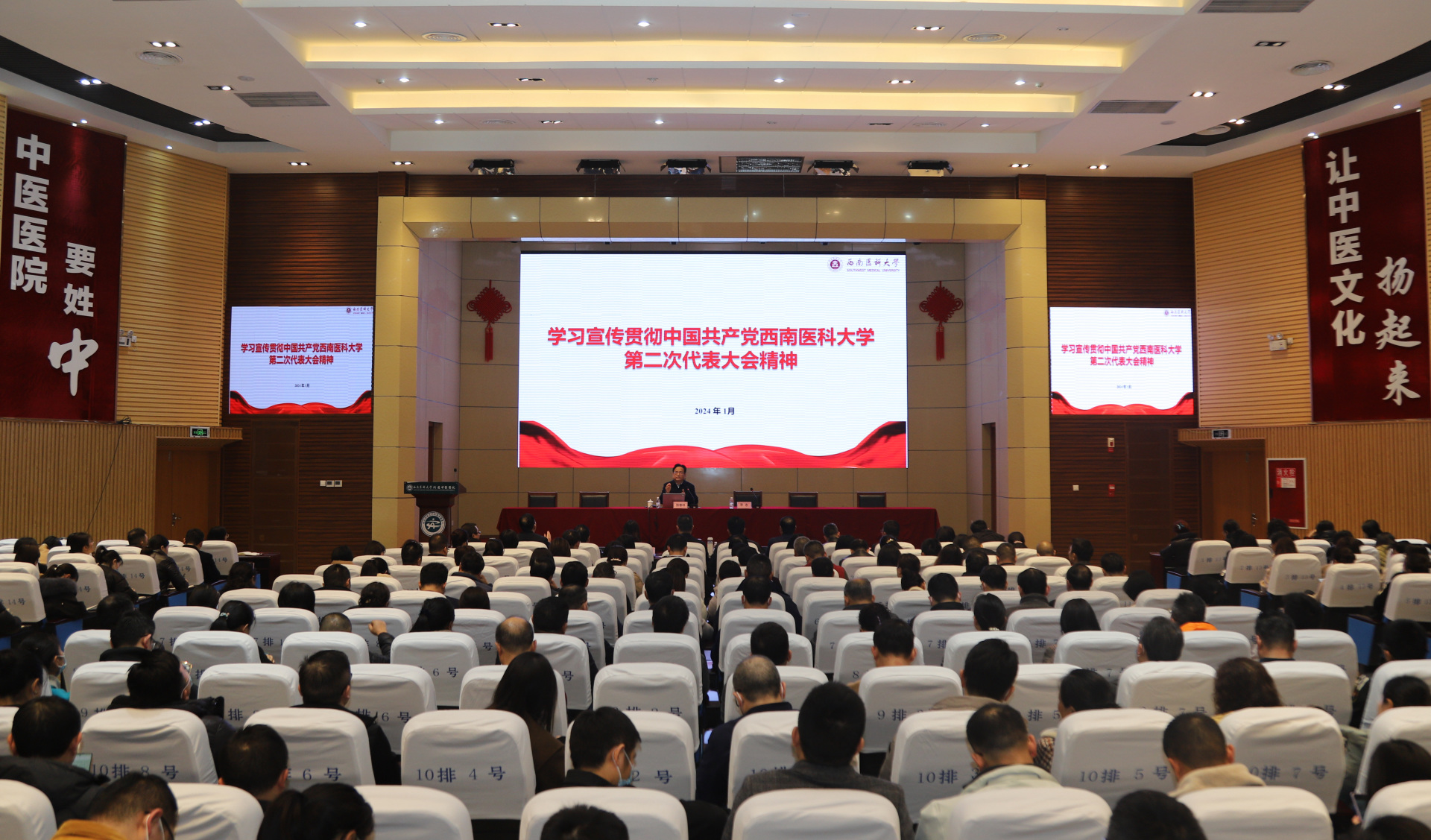会议邀请了西南医科大学党委副书记、校长张春祥教授为全体人员开展专题讲座。张春祥校长从西南医科大学第二次党代会的主题与重大意义、深刻学习领会学校过去五年取得的成就、深入实施“138”发展战略,聚焦重点任务,推动学校高质量发展三个方面对学习宣传贯彻西南医科大学第二次党代会精神进行了专题辅导。张春祥校长指出,“138”发展战略与西南医科大学第一次党代会提出的“136”发展战略一脉相承,既充分考虑了当前发展环境以及学校现有发展基础,又实现了与上一次党代会提出的“三步走”战略部署的目标任务有机衔接,体现了学校党委一张蓝图绘到底的决心和信心。张春祥校长要求,作为西南医科大学的一分子,要坚贞不渝立“志气”、勤学善思长“才气”、不忘初心接“地气”,不负青春韶华、不负组织重托,努力把自身才干转化为推动学校高质量发展的不竭动力,要坚持把学习宣传贯彻西南医科大学第二次党代会精神作为当前和今后一个时期的重要政治任务,多途径抓好宣传教育,多举措开展专题研讨,切实学懂弄通做实,细化分解目标任务,确定“路线图” 绘好“时间表”、制定“任务书”,确保党代会精神落地见效。