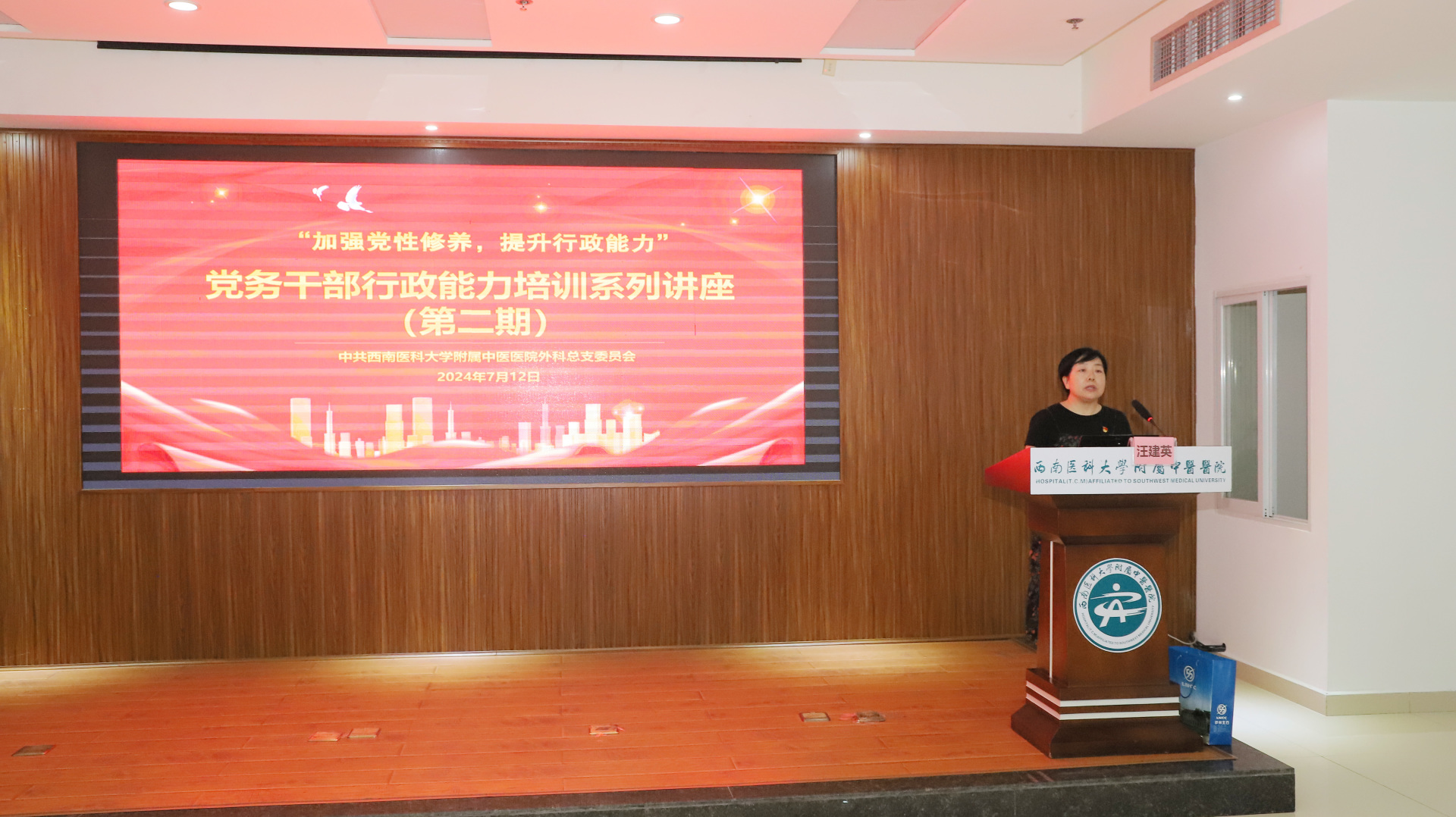 2024年7月12日,我院外科党总支组织开展了主题为“加强党性修养,提升行政能力”的党务行政能力培训系列讲座(第二期)。外科各党支部党员及科研部、学科建设办、伦理办、中西医结合研究中心和中西医结合药物研究中心等部门、科室工作人员共60余人参加了培训。会议由医院副院长张磊主持。