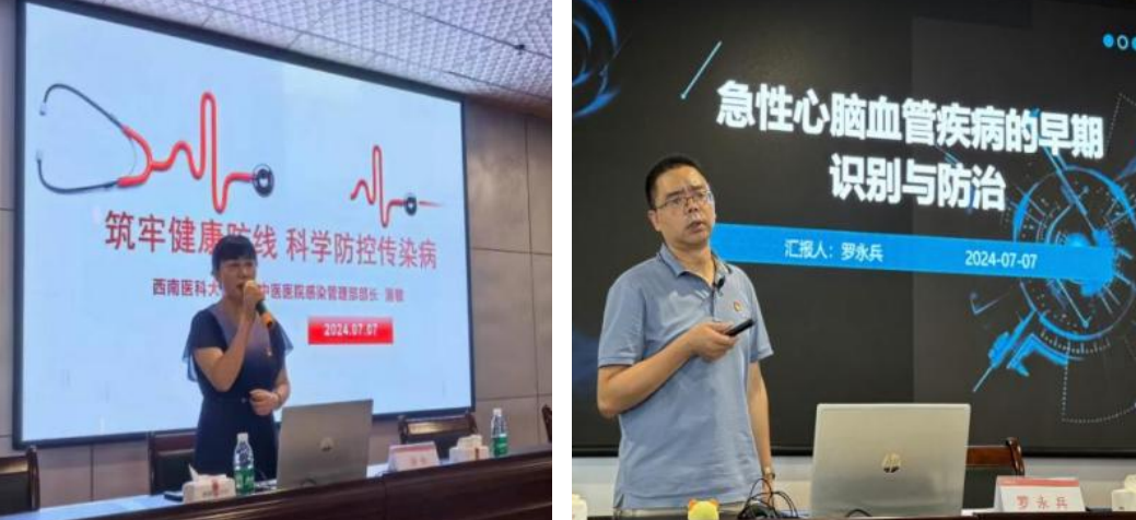 在随后举行的沙龙活动中,医院感染管理部部长蒲敏作了《筑牢健康防线科学防控传染病》专题讲座,罗永兵副教授作了《急性心脑血管疾病的早期识别及防控》专题讲座,水井沟急诊科护士长邓钰作了心肺复苏应急演练和培训。