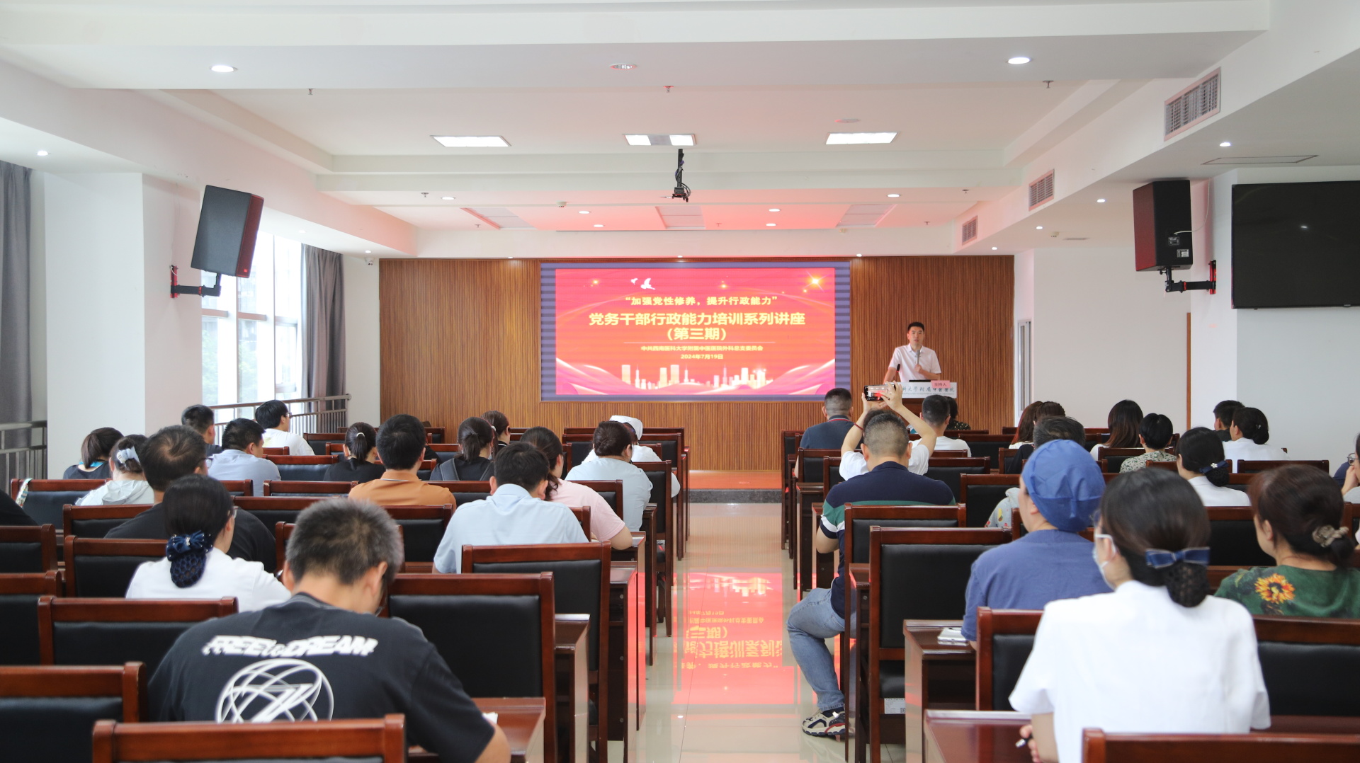 2024年7月19日,我院外科党总支组织开展了主题为“加强党性修养,提升行政能力”的党务行政能力培训系列讲座(第三期)。外科党总支下辖各党支部党员及科研部、学科建设办、伦理办、中西医结合研究中心和中西医结合药物研究中心等部门、科室工作人员共60余人参加了培训。会议由医院副院长张磊主持。