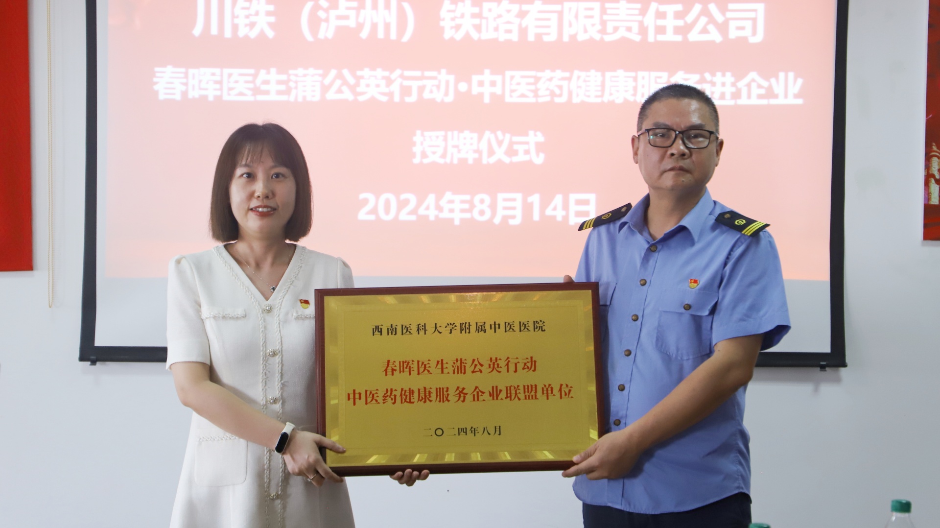 随后,胡琼丹代表医院向川铁(泸州)铁路有限责任公司授予“春晖医生蒲公英行动·中医药健康服务企业联盟单位”牌匾。