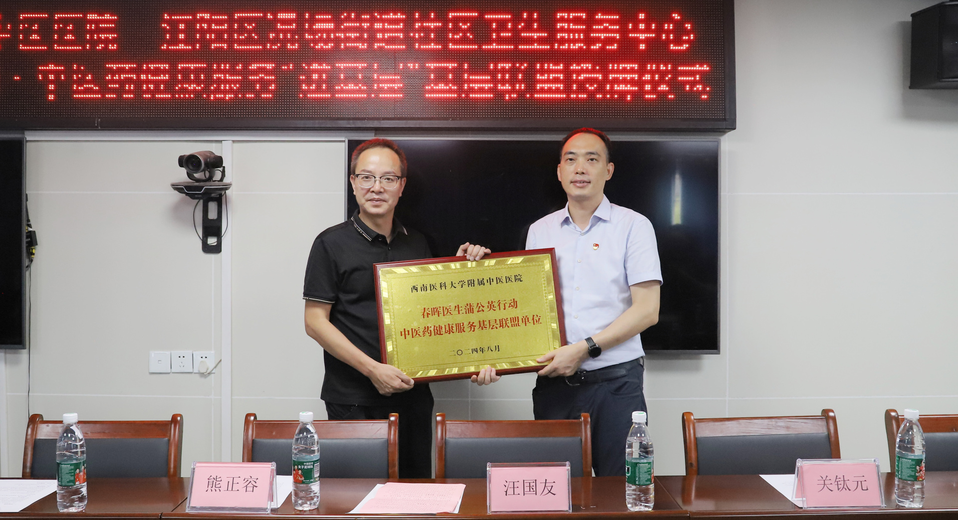 随后,汪国友代表医院为江阳区况场社区卫生服务中心授予“春晖医生蒲公英行动·中医药健康服务基层联盟单位”牌匾。