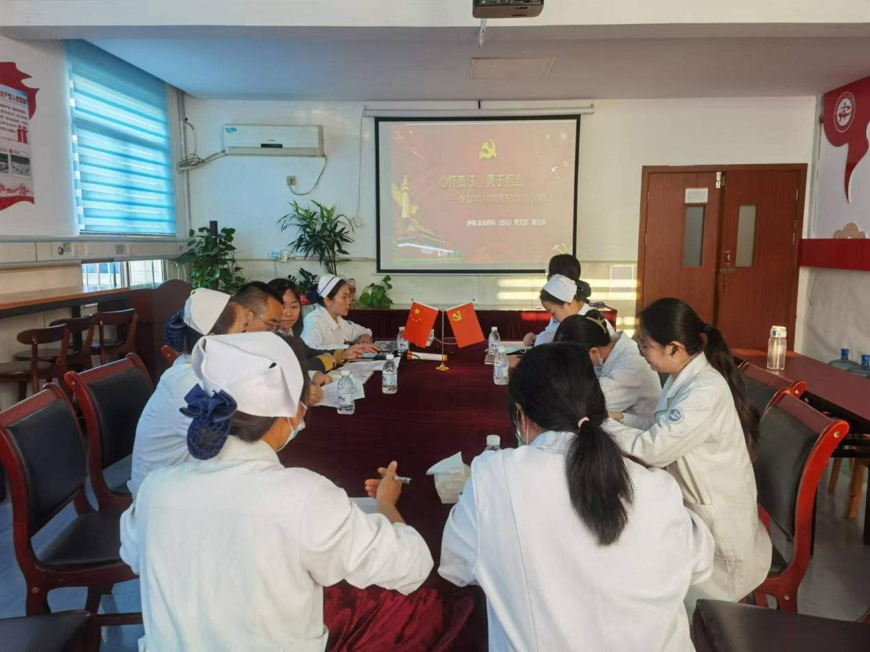 联合党建活动后,肿瘤·血液病科(忠山)党支部召开了党员大会及党纪学习教育会。会上,党支部书记张燕同志传达了医院党委党纪学习教育总结会上的内容,对党纪学习教育常态化和支部工作作了相应安排;刘成凤同志领学了习近平在全国教育大会上的重要讲话精神等;支委鲁光洪同志领学《习近平新时代中国特色社会主义思想学习问答》,并结合党务干部培训心得,以《心怀责任,勇于担当》为题作了讲座。