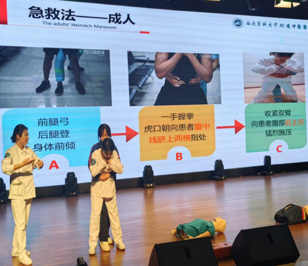 随后,相关党支部同志开展了中医适宜技术宣传推广、健康咨询及义诊活动;水井沟急诊科邓钰和蒋小兰同志现场向该校同学作了海姆立克急救法、心肺复苏科普知识宣讲和技能演示。