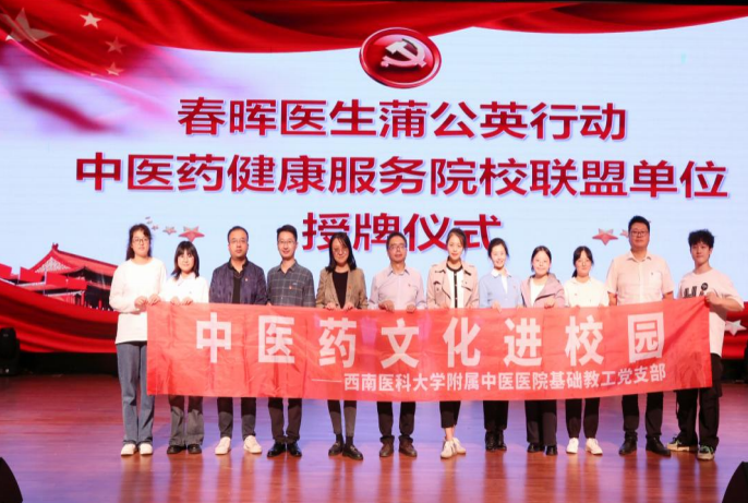 2024年10月17日,我院基础教工党支部与泸州市江阳区梓潼路学校开展了春晖医生蒲公英行动·中医药健康服务院校联盟单位授牌仪式暨“中医药文化进校园”活动。我院学生党总支书记谢晓东、梓潼路学校校长袁晓莉,护理感染预防党支部、综合内科党支部、学生第一党支部、水井沟急诊科党支部等支部同志参加了活动。