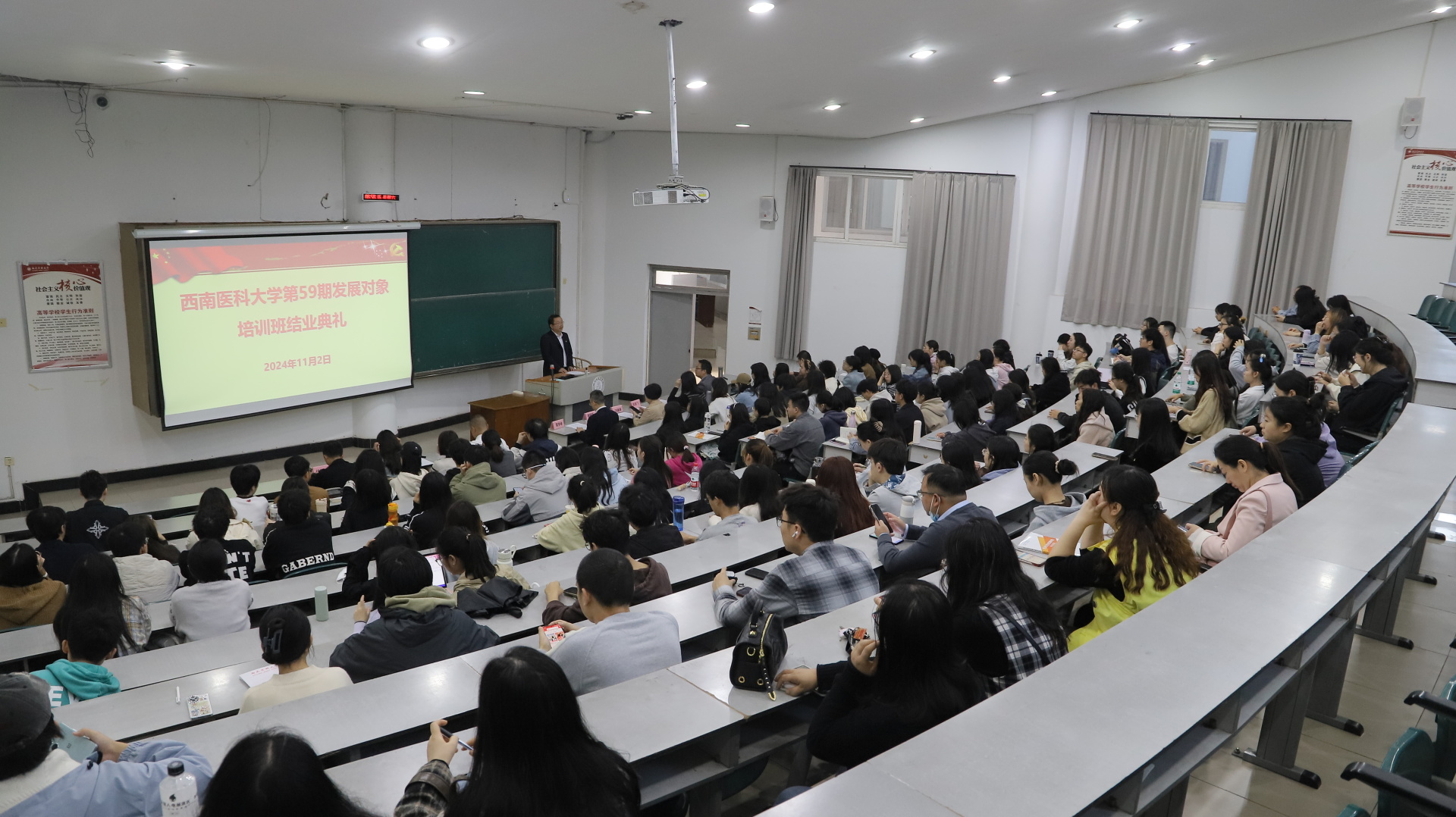 2024年11月2日,西南医科大学党校第59期(中西医结合学院分党校第2期)发展对象培训班结业典礼在荟文楼201举行。中西医结合学院•附属中医医院党委副书记、分党校副校长雷学举,党委副书记、纪委书记、分党校副校长鄢飞鹏等党校校务委员、送培院系指导老师、培训班指导老师及149名发展对象参加了结业典礼。结业典礼由中西医结合学院·附属中医医院学生党总支书记、分党校校务委员谢晓东主持。