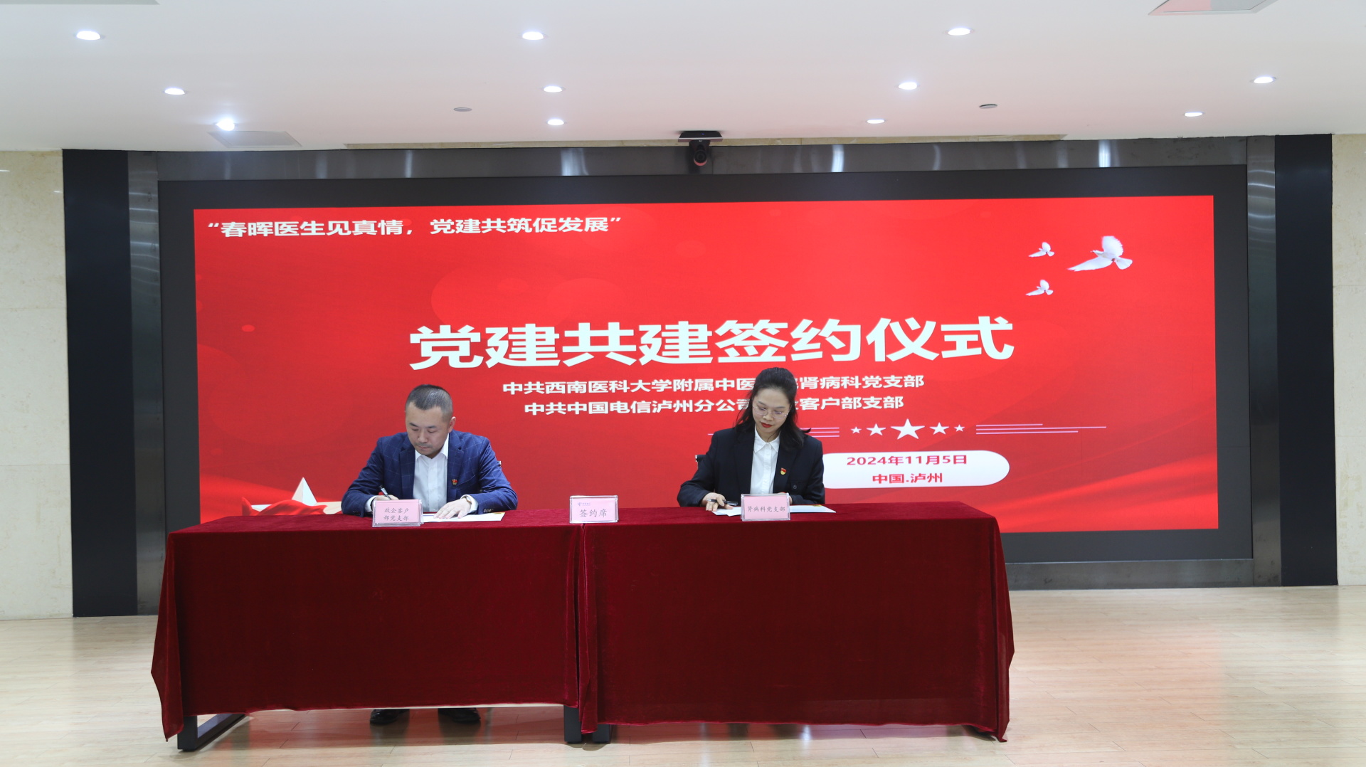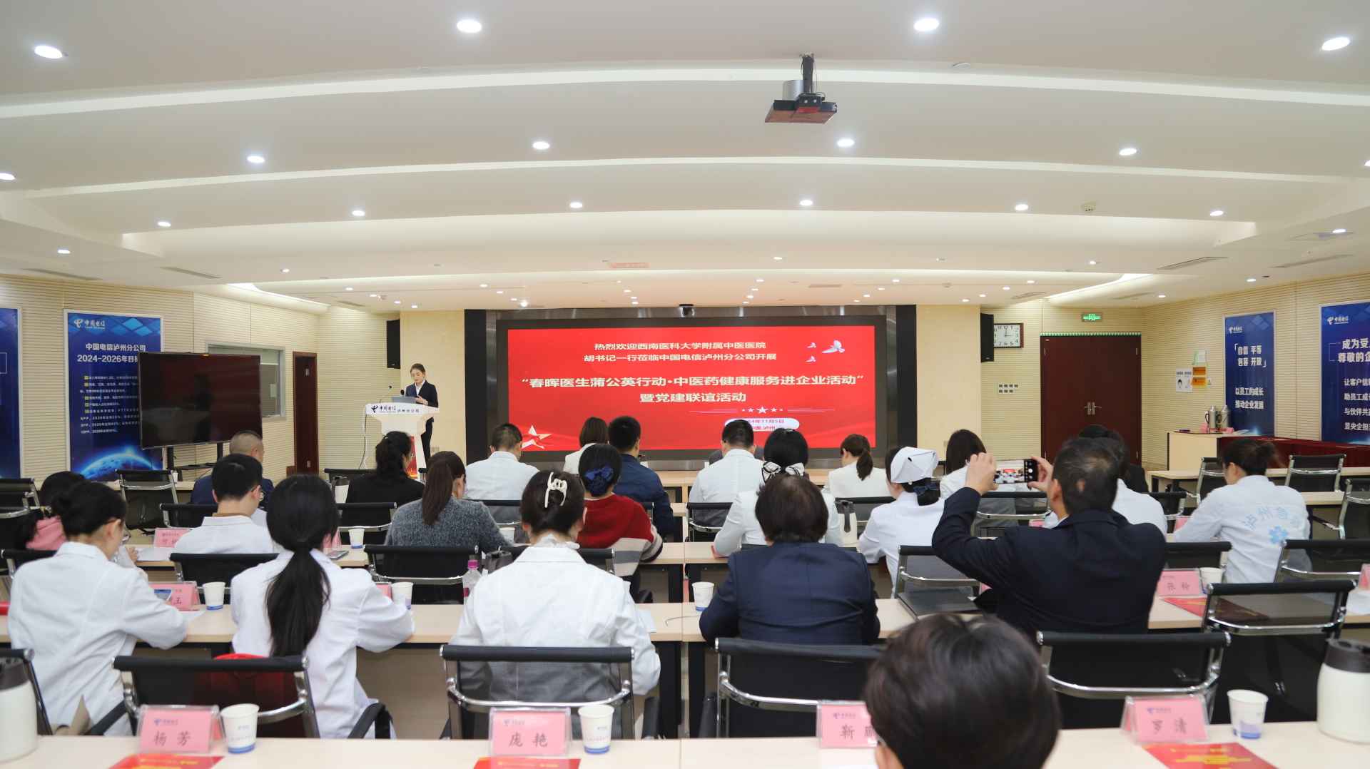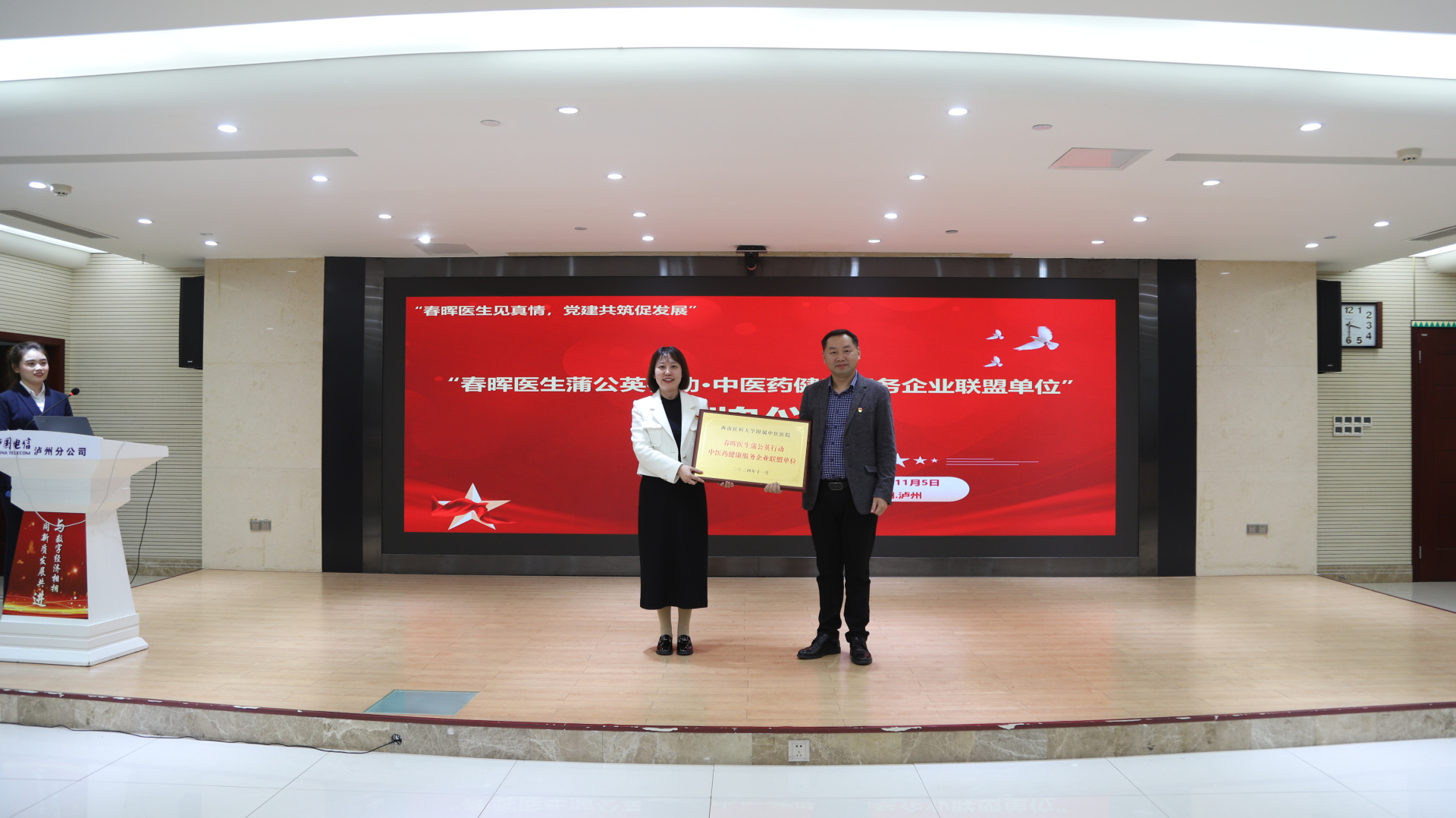 2024年11月5日,我院肾病科党支部与中国电信股份有限公司泸州分公司举行了春晖医生蒲公英行动·中医药健康服务企业联盟单位授牌仪式,医院内科党总支书记胡琼丹,中国电信泸州分公司党委成员、副总经理宋良彬,中国电信泸州分公司政企客户部党支部书记、总经理罗彬及职工代表,医院相关党支部成员等参加了仪式。