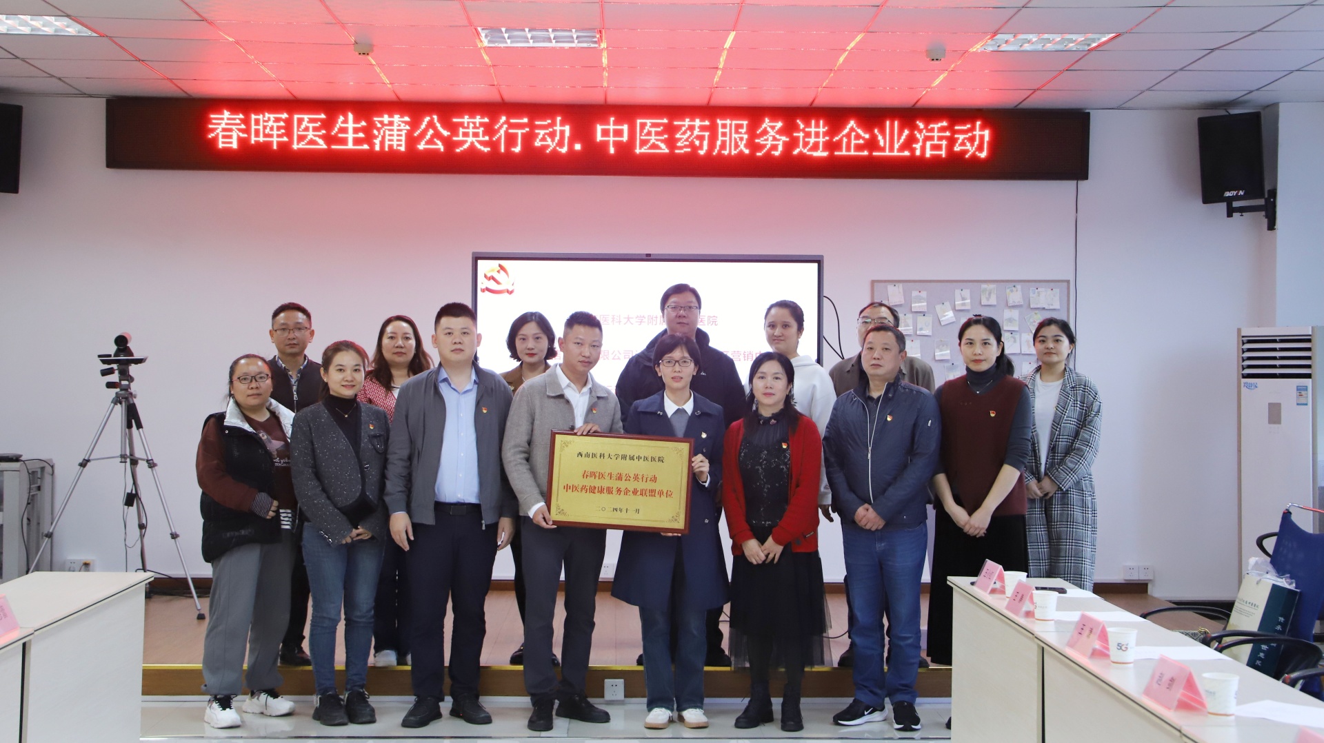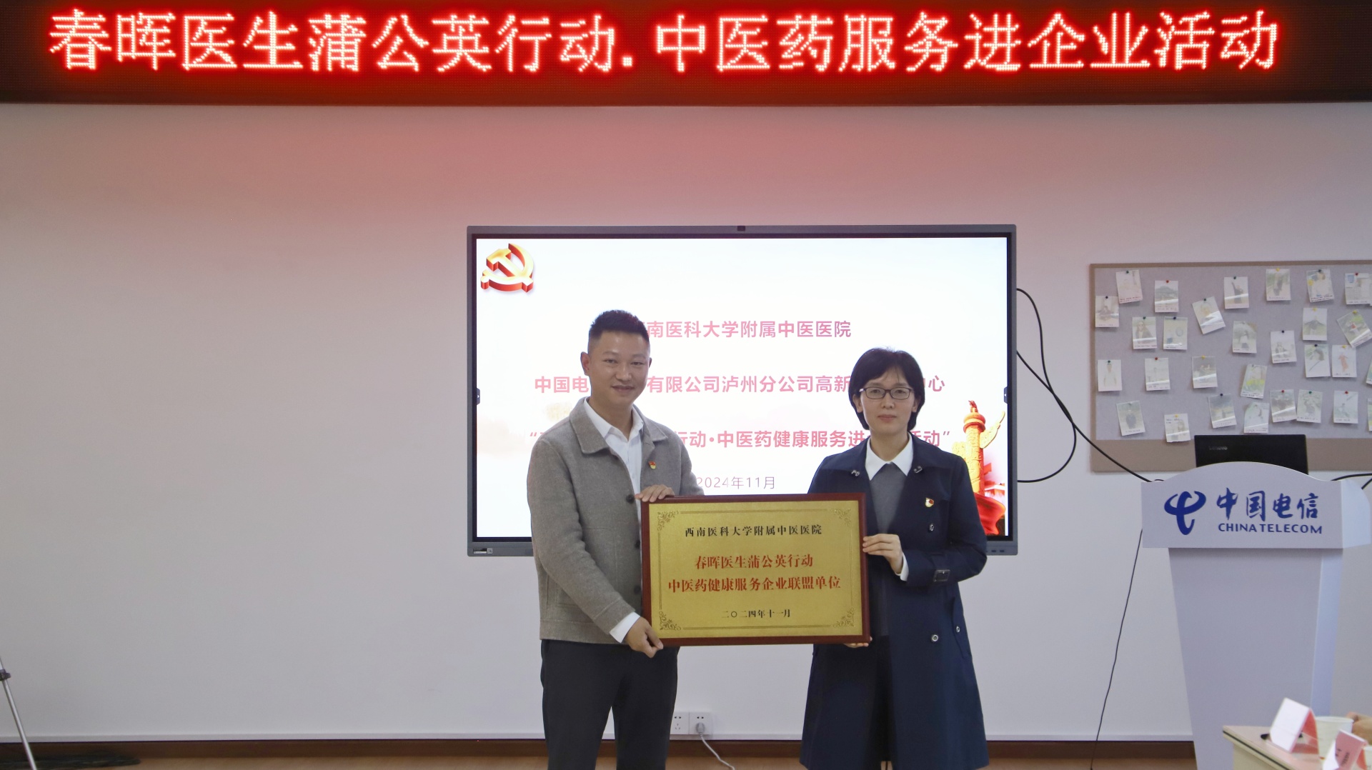 随后,董丽代表医院向中国电信股份有限公司泸州分公司高新区营销中心授予“春晖医生蒲公英行动·中医药健康服务企业联盟单位”牌匾。