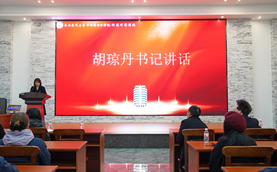 胡琼丹讲话,她介绍了医院基本情况及春晖医生蒲公英行动·中医药健康服务站、中医药健康服务企业联盟建设工作情况,表示此次授牌活动是我院党建优秀工作品牌——春晖医生蒲公英行动的又一创新举措,是“春晖医生蒲公英行动·中医药健康服务站”的延伸,是春晖医生蒲公英“三进”专项行动(进企业、进学校、进基层)之一。她希望呼吸内科党支部和人力资源部党支部以此次授牌为契机,进一步充分发挥中医药特色优势,进一步传播中医药传统文化,进一步下沉中医药优势资源,深入群众,深入基层,为泸州及周边地区的人民群众提供更加优质的中医药健康服务,助推泸州新时代区域医药健康中心和中医药强市建设,让越来越多的老百姓信中医、爱中医、用中医。