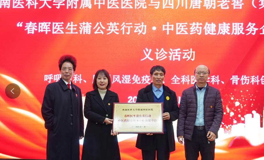 随后,胡琼丹代表医院向四川唐朝老窖(集团)有限公司授予了“春晖医生蒲公英行动·中医药健康服务企业联盟单位”牌匾。