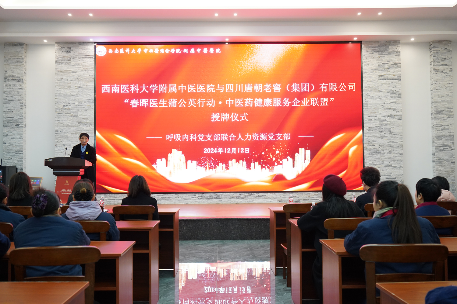 2024年12月12日,我院呼吸内科党支部联合人力资源党支部与四川唐朝老窖(集团)有限公司举行了春晖医生蒲公英行动·中医药健康服务企业联盟单位授牌仪式。医院内科党总支书记胡琼丹、四川唐朝老窖(集团)有限公司董事长刘本良、公司职工代表以及医院相关党支部同志等参加了仪式。