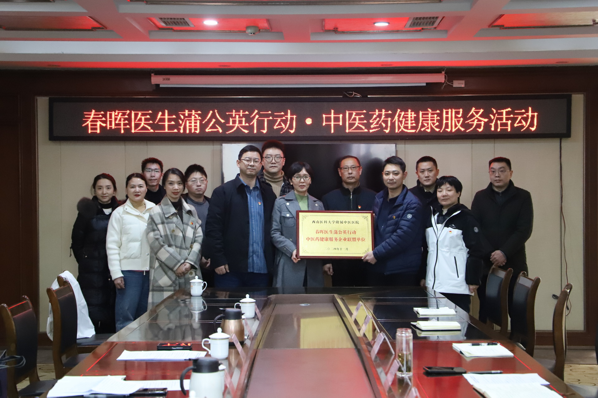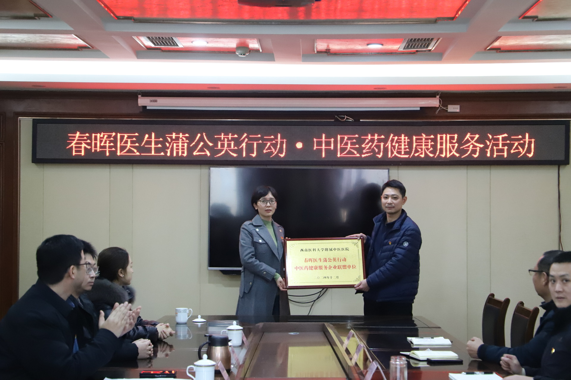 随后,董丽代表医院向泸州市建筑业发展中心授予了“春晖医生蒲公英行动·中医药健康服务企业联盟单位”牌匾。