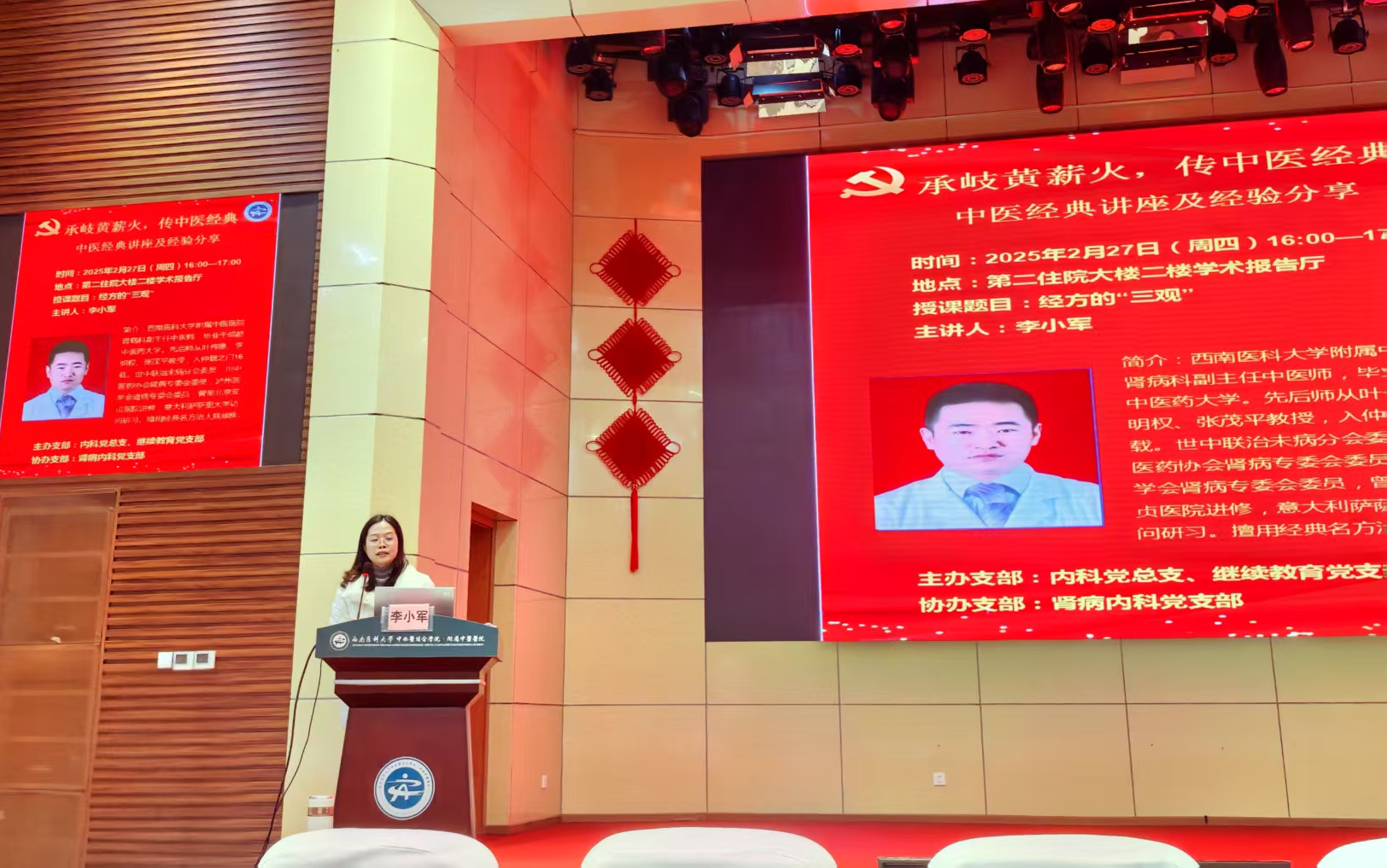 2025年2月27日,由内科党总支、继续教育党支部主办,肾病科党支部协办的“承岐黄薪火,传中医经典”中医经典讲座及经验分享(第15期)在我院第二住院大楼学术演讲厅举行。内科党总支委员、继续教育部工作人员、医院部分党员、发展对象、入党积极分子和全体规培学员参加了培训。