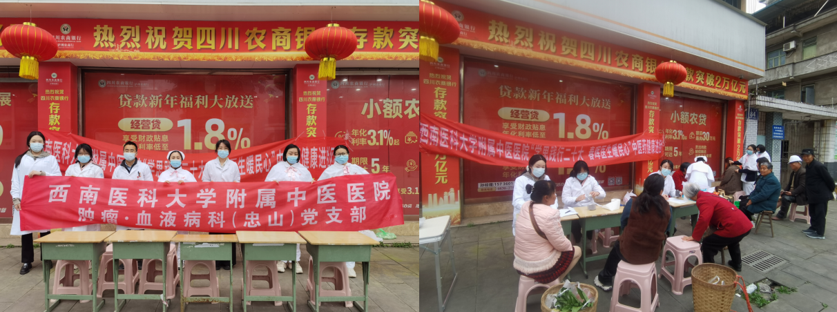 3月28日,肿瘤·血液病科(忠山)党支部联合综合内科党支部、超声影像科党支部及中西医结合研究生党支部到龙马潭区特兴街道街村社区开展了“春晖医生蒲公英行动”中医药健康行义诊活动。医务人员为社区居民开展了健康宣教,提供了中药塌渍、杵针、艾灸等中医药特色技术体验。