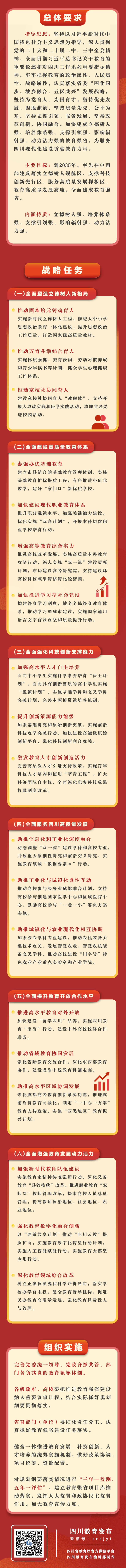 2025年5月,四川省人民政府印发《教育强省建设规划纲要(2025一2035年)》(以下简称《纲要》)。《纲要》提出到2035年,率先在中西部建成落实立德树人领航区、支撑科技创新先行区、服务高质量发展样板区、教育高质量发展高地,全面建成教育强省。立德树人强。习近平新时代中国特色社会主义思想入脑入心,育人观念科学先进,育人方式多元立体,教育功利化倾向根本扭转,学生理想信念、健全人格、创新思维、实践能力、社会责任培养取得实效。培养体系强。构建固本铸魂的思想政治教育体系、公平优质的基础教育体系、自强卓越的高等教育体系、产教融合的职业教育体系、泛在可及的终身教育体系、创新牵引的科技支撑体系、素质精良的教师队伍体系、开放互鉴的对外合作体系。支撑引领强。人才供给与经济社会需求适配,职普融通、产教融合、科教融汇有力,“双一流”建设创新力引领力全面提高,“双高计划”支撑能力全面提升,教育服务国家战略更加高效,服务经济社会发展能力显著跃升。影响辐射强。产生一批教育行家专家、名师大师,产出一批有重要影响力的教学成果,形成一批知名学校和办学品牌。动力活力强。教育优先发展战略地位更加巩固,教育综合改革更加深入,教育数字化水平明显提高,高素质专业化人才队伍不断壮大,高水平教育保障持续加强,全社会参与的协同育人机制全面形成。