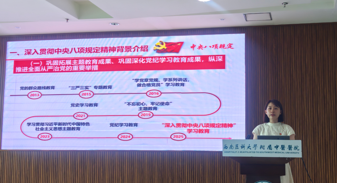 会上,内科党总支书记胡琼丹同志以《中央八项规定精神讲解》为题作了专题讲座,她主要从深入贯彻中央八项规定精神背景介绍、中央八项规定精神的主要内容、违反中央八项规定精神的数字解读、违反中央八项规定精神的典型案例、如何贯彻落实好中央八项规定精神五个方面进行了讲解。