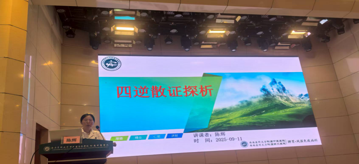 会上,脾胃·风湿免疫病科陈辉教授以《四逆散证探析》为题作了专题讲座。她讲述了“四逆散”的渊源、核心功效等内容,重点围绕少阳病少阴的理论依据、“四逆散”的条文依据、方药分析及疗效机制,结合临床进行深入浅出地讲解“四逆散”的辨证使用,通过“四逆散”经典合方的使用及介绍“四逆散”的现代研究拓展应用,让学员们对“四逆散”的正确辨证使用、拓展运用及治疗进展有了更深入的了解。