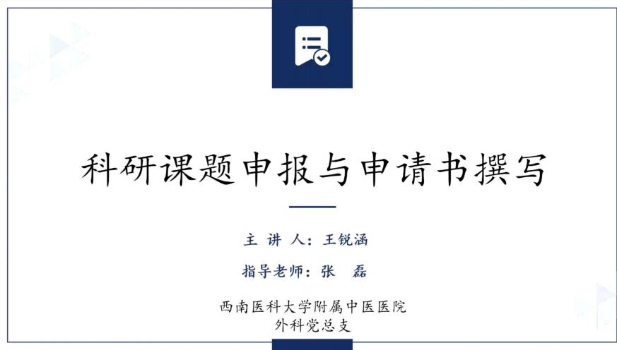 9月14日,“党建引领 杏火燎研”科研基础培训会(第二次)召开,我院肾病科副主任胡琼丹党员同志、西南医科大学硕士研究生王锐涵党员同志分别作了《SCI 论文的写作》《科研课题申报与申请书撰写》专题讲座。