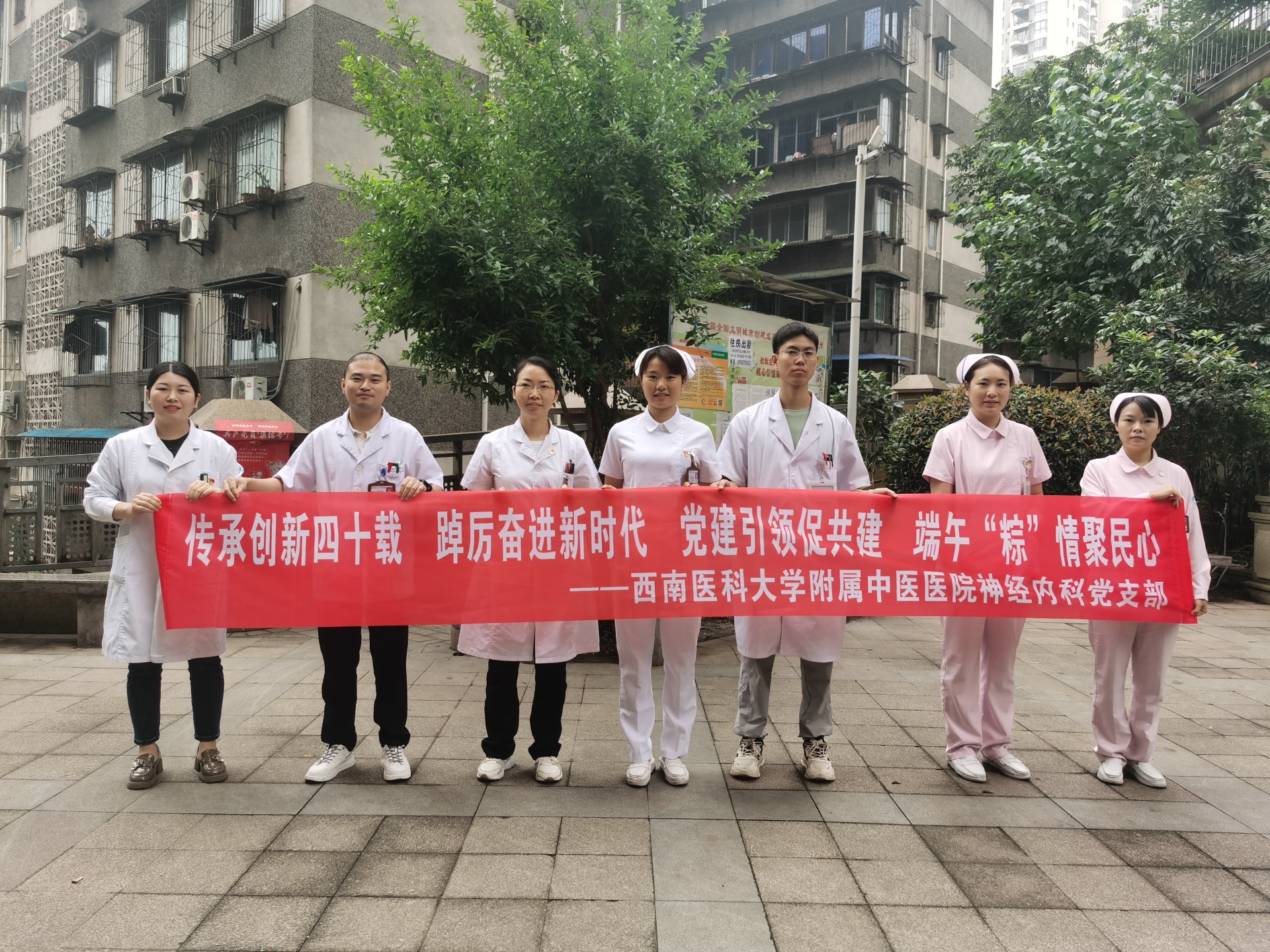 6月16日,神经内科党支部联合放射影像科(介入)党支部、城北门诊党支部到江阳区长江蓝湾小区开展了“传承创新四十载 踔厉奋进新时代 党建引领促共建 端午'粽'情聚民心”主题义诊活动。
