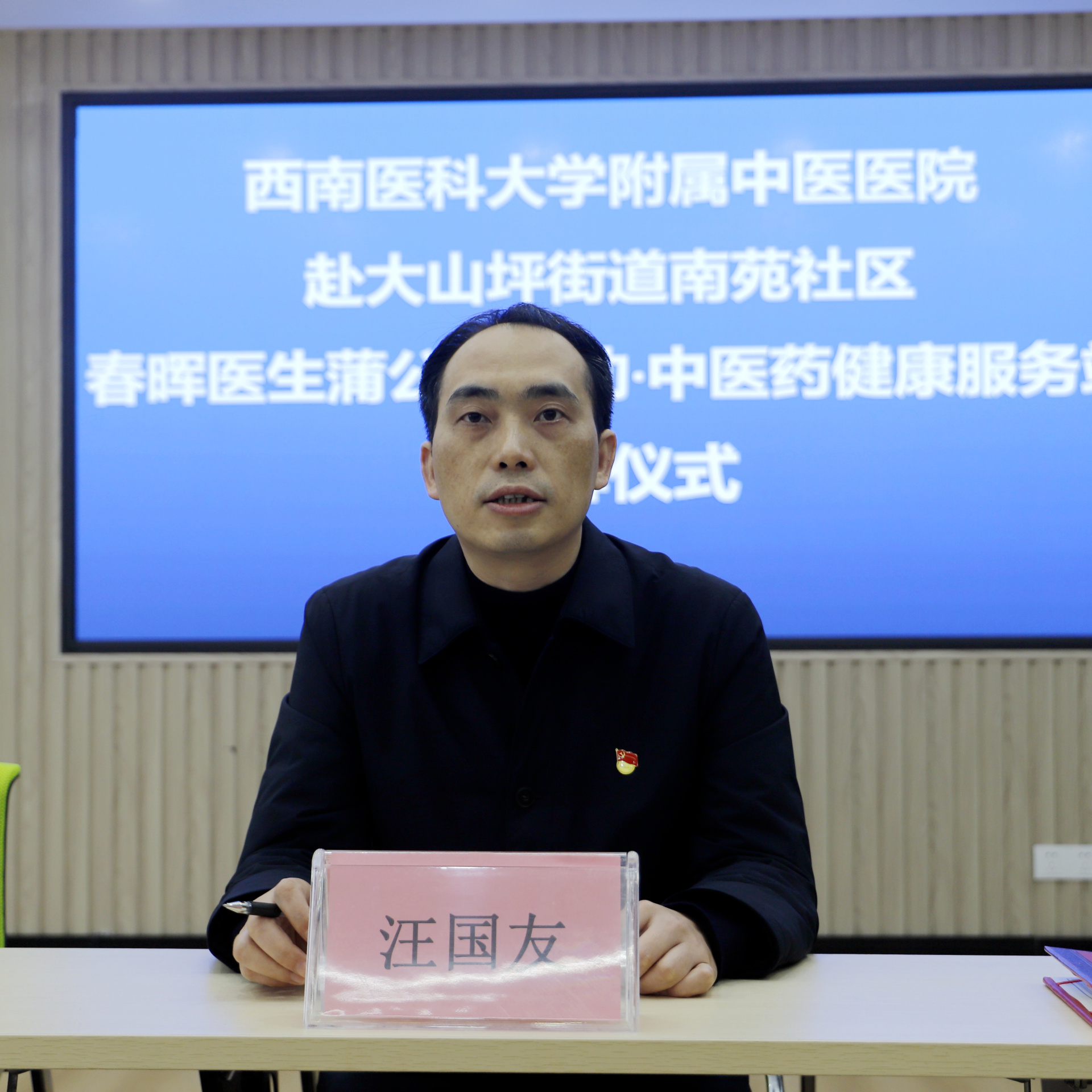 汪国友讲话,他介绍了医院基本概况和春晖医生蒲公英行动·中医药健康服务站建设情况,希望相关党支部秉承“资源互补、优势共享”的合作原则,践行“千方百计、臻于至善”的服务理念,通过与社区的深入合作,进一步推进党建与业务工作的互促共融,进一步丰富中医药健康行动的活动形式,全面提升基层中医药服务水平,为推动泸州建成区域医药健康中心、打造成渝地区医疗救治第三极作出新的贡献。