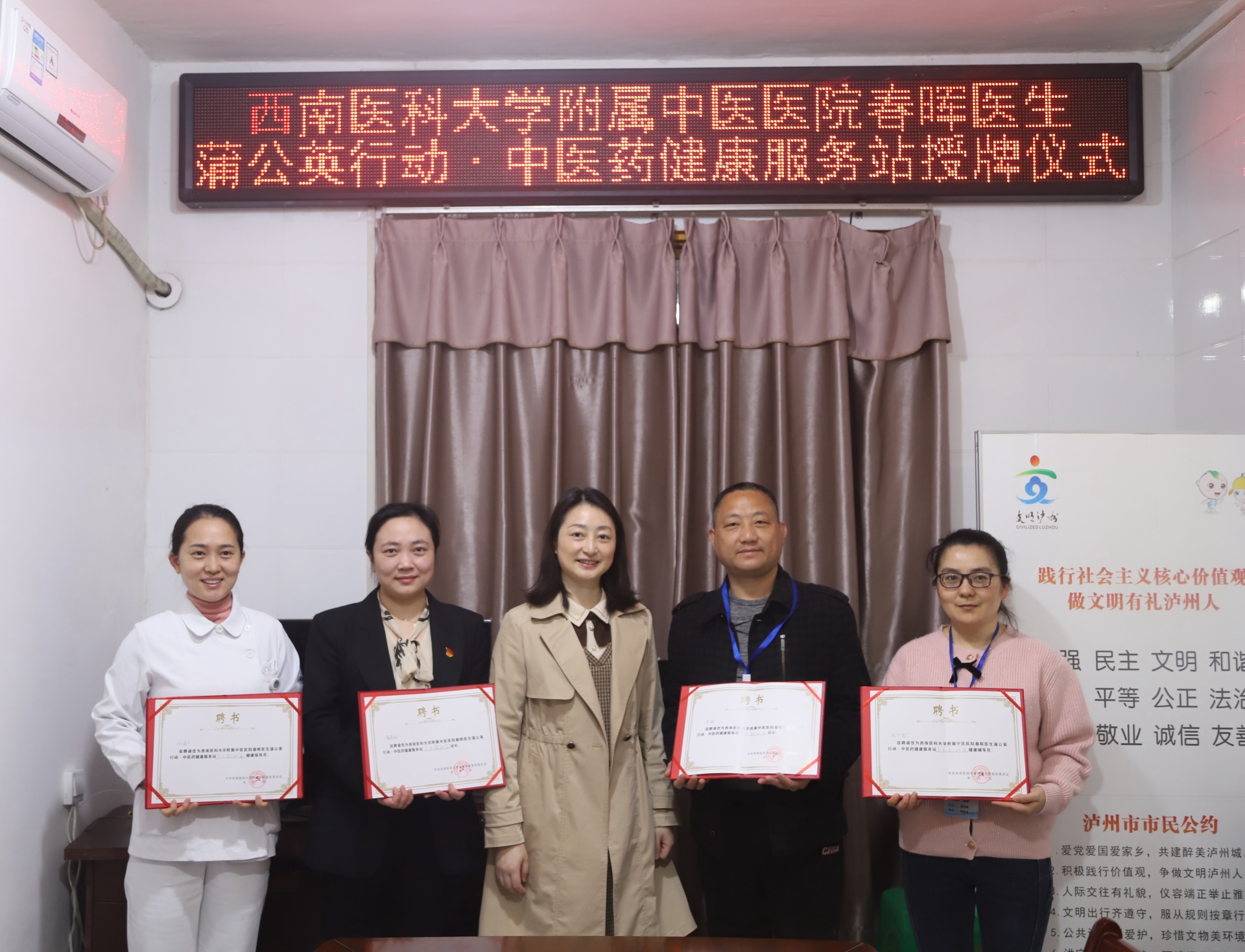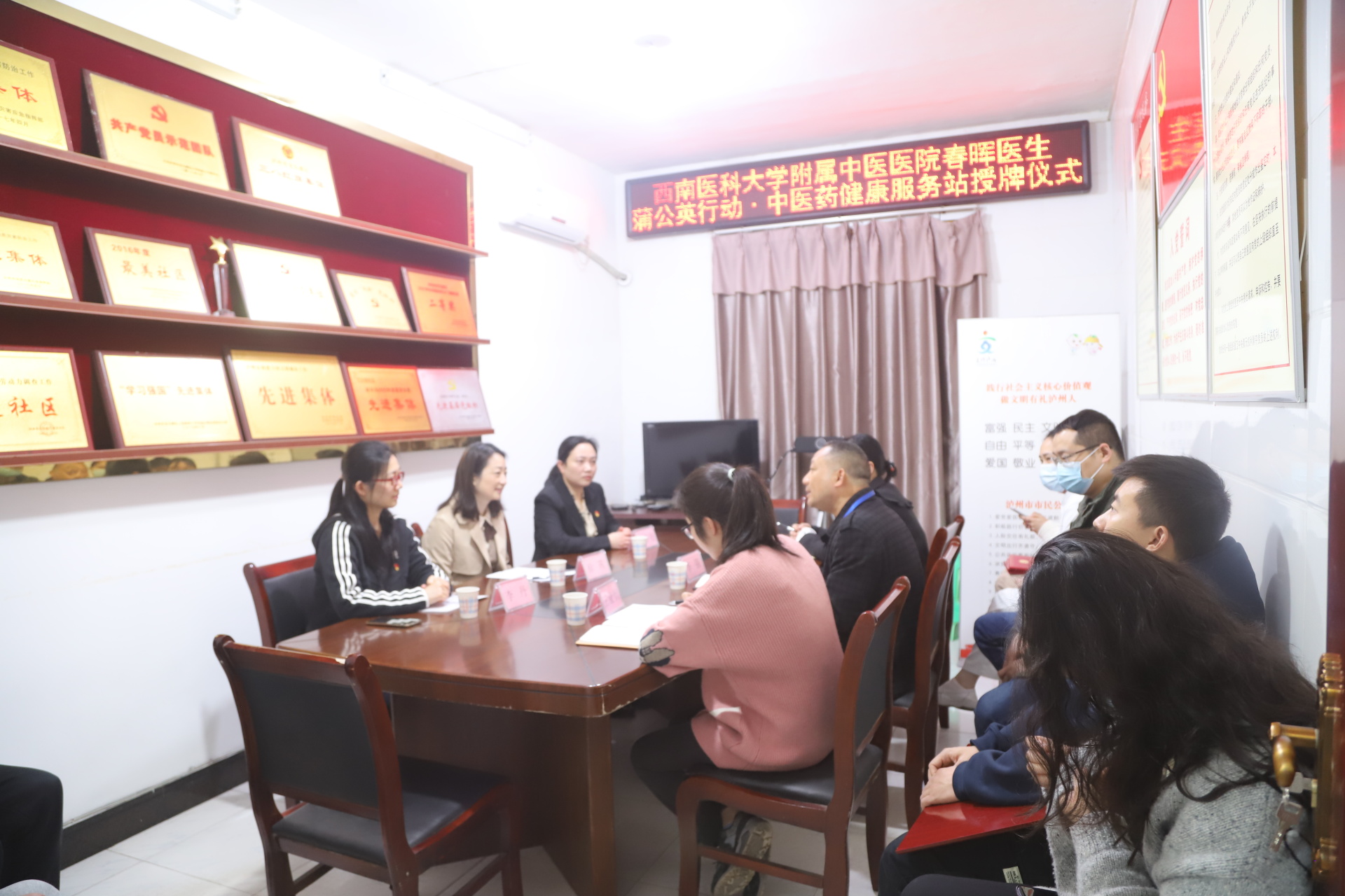 仪式上,李强介绍了下大街社区的基本情况;徐茜代表医院向下大街社区授予了“春晖医生蒲公英行动·中医药健康服务站”牌匾,并向相关人员颁发了服务站站长、健康指导员和健康辅导员聘书。