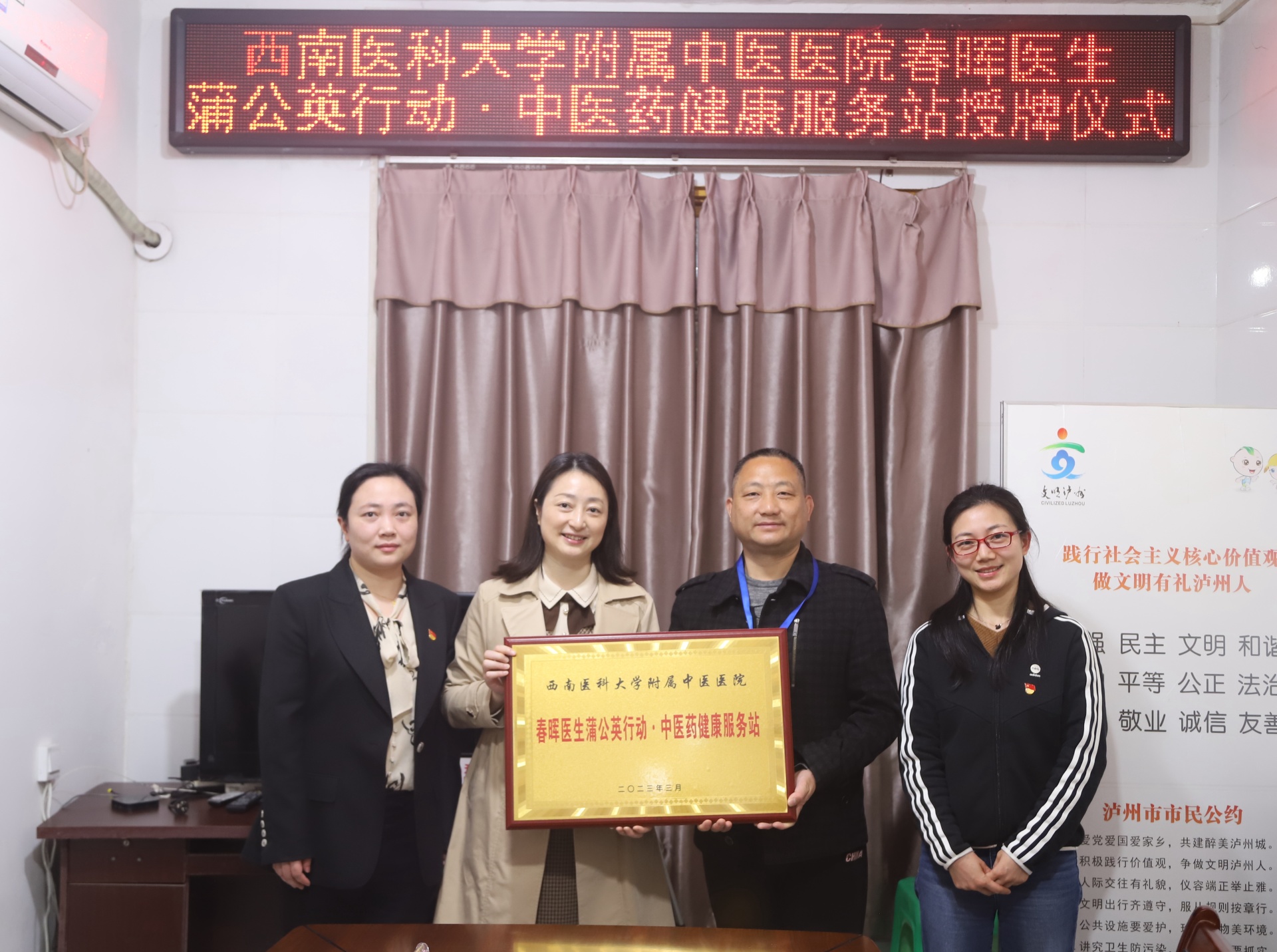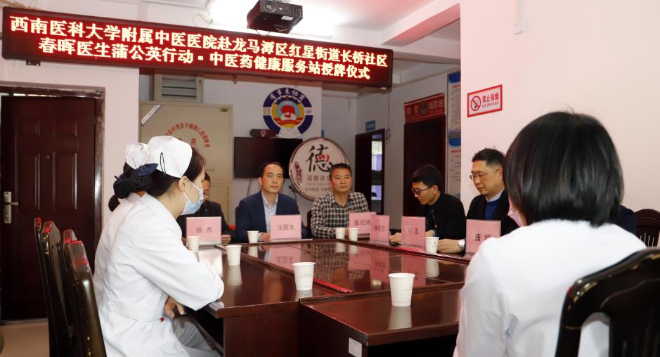 2023年3月22日,我院皮肤科党支部、医保信息党支部与龙马潭区小市街道下大街社区党委开展了春晖医生蒲公英行动·中医药健康服务站授牌仪式,我院党委副书记·纪委书记徐茜、下大街社区党委书记李强、我院相关党支部成员及社区人员等参加了仪式。