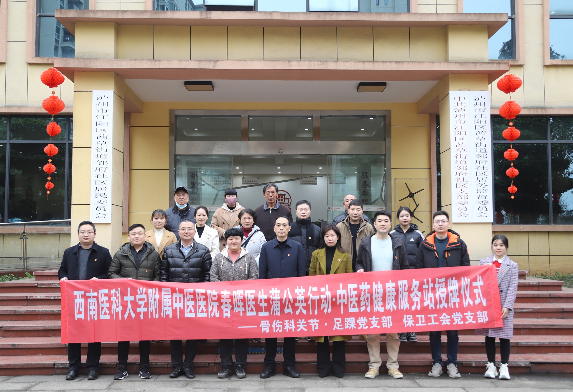 2023年2月15日,我院骨伤科关节·足踝党支部、保卫工会党支部与泸州市江阳区茜草街道邻府社区党支部开展了春晖医生蒲公英行动·中医药健康服务站授牌仪式,我院副院长汪国友、茜草街道人大工委主任许开琼、邻府社区党支部书记傅泸、我院相关党支部成员及社区居民等参加了仪式。