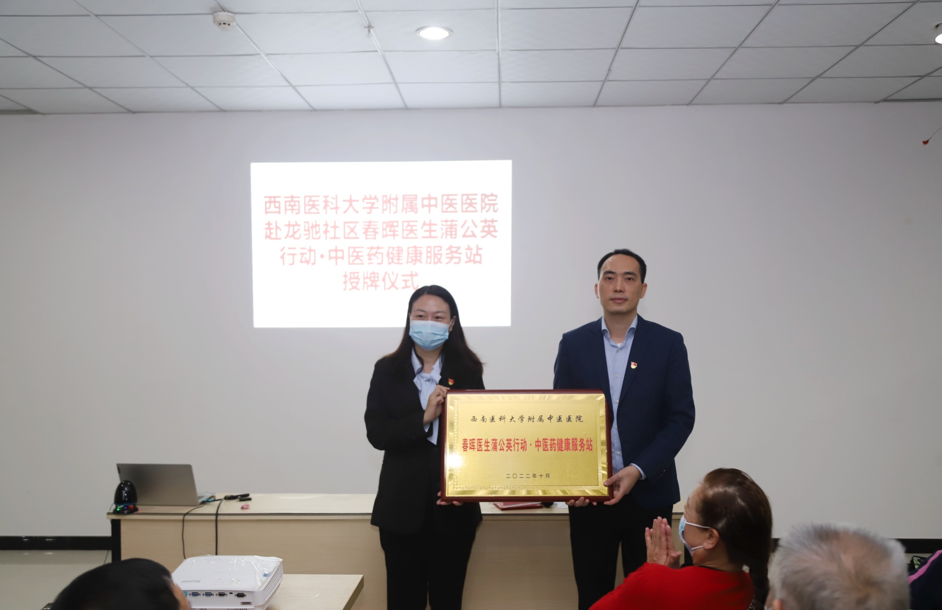 2022年10月28日,我院制剂室党支部、内分泌代谢党支部与泸州市江阳区龙驰路社区党委举行了春晖医生蒲公英行动·中医药健康服务站授牌仪式,医院副院长汪国友、龙驰路社区党委书记周容及我院相关党支部医务人员、社区相关人员等参加了仪式。仪式由周容主持。