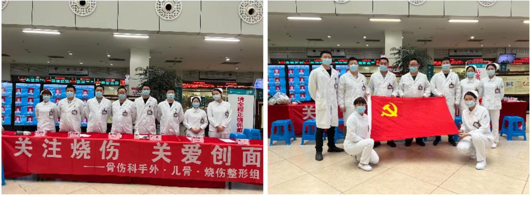 会前,骨伤科手外 ·儿 骨 ·烧 伤整形党支部全体成员在门诊大厅开展了“关注烧伤 关爱创面”义诊活动。