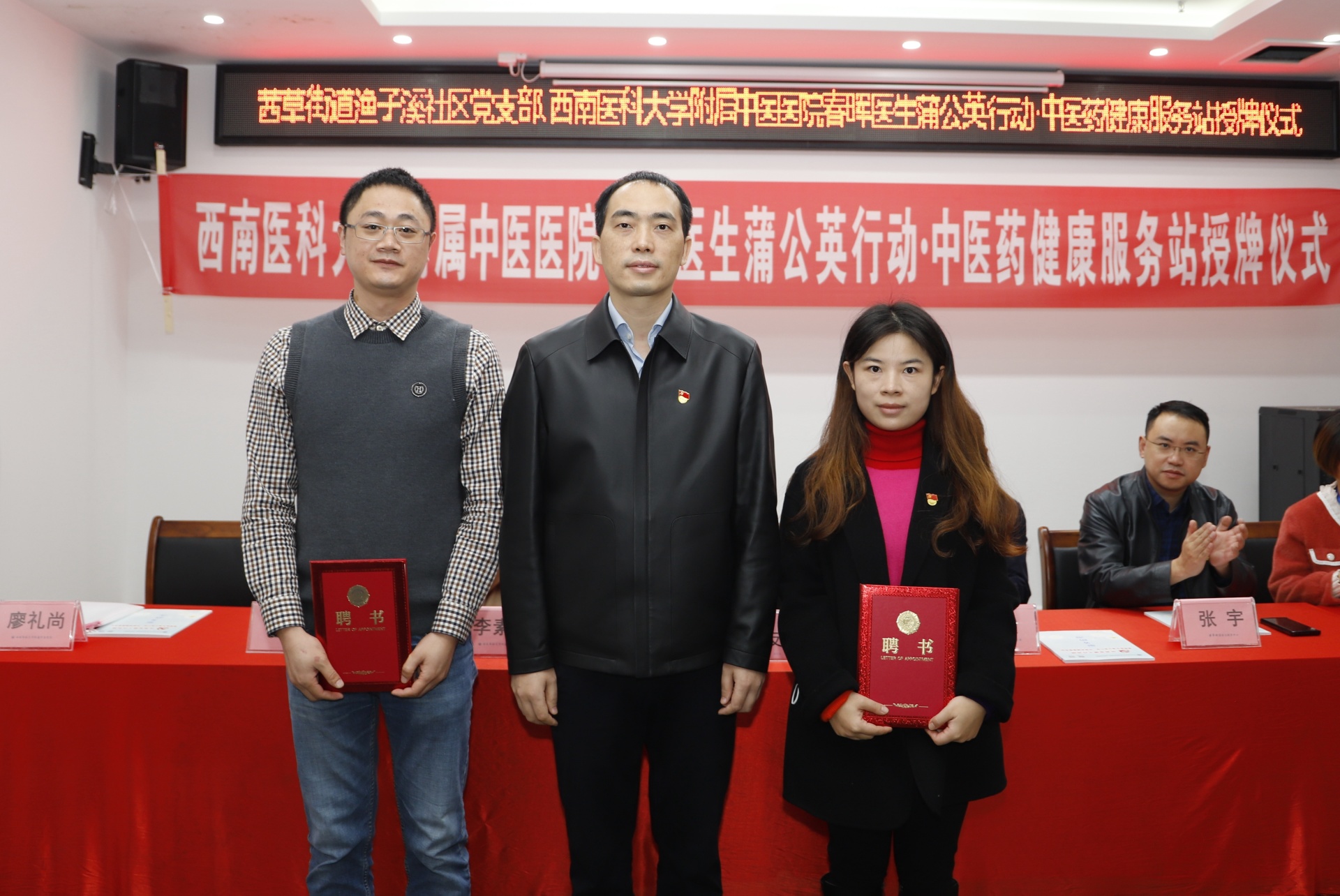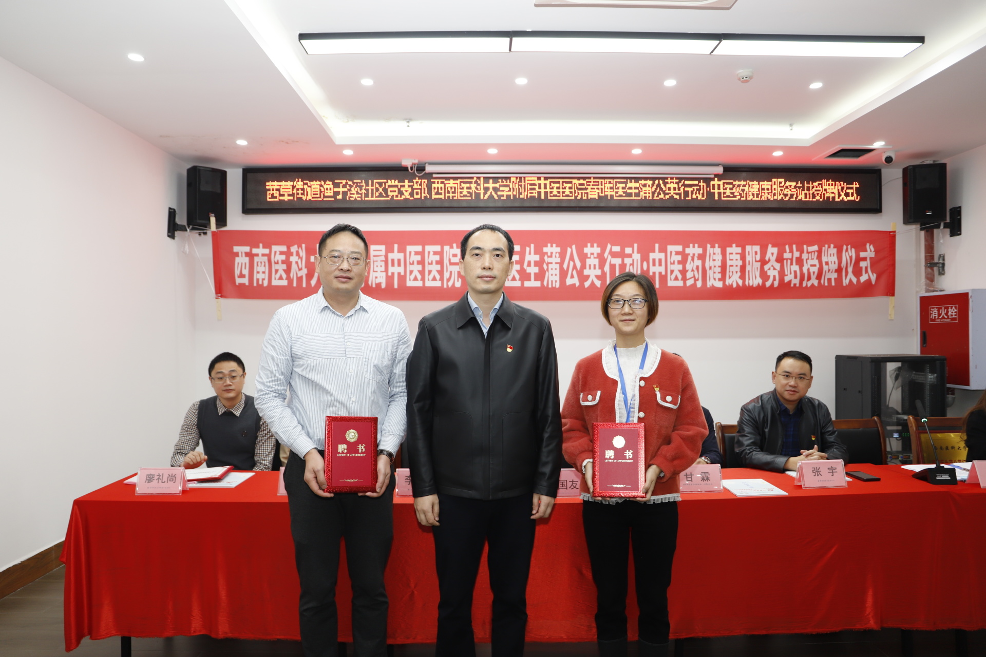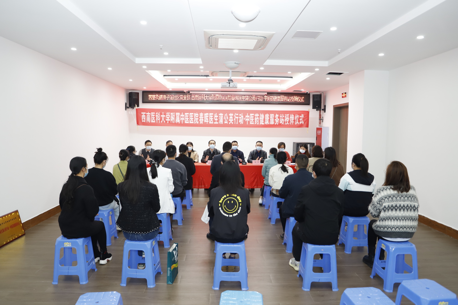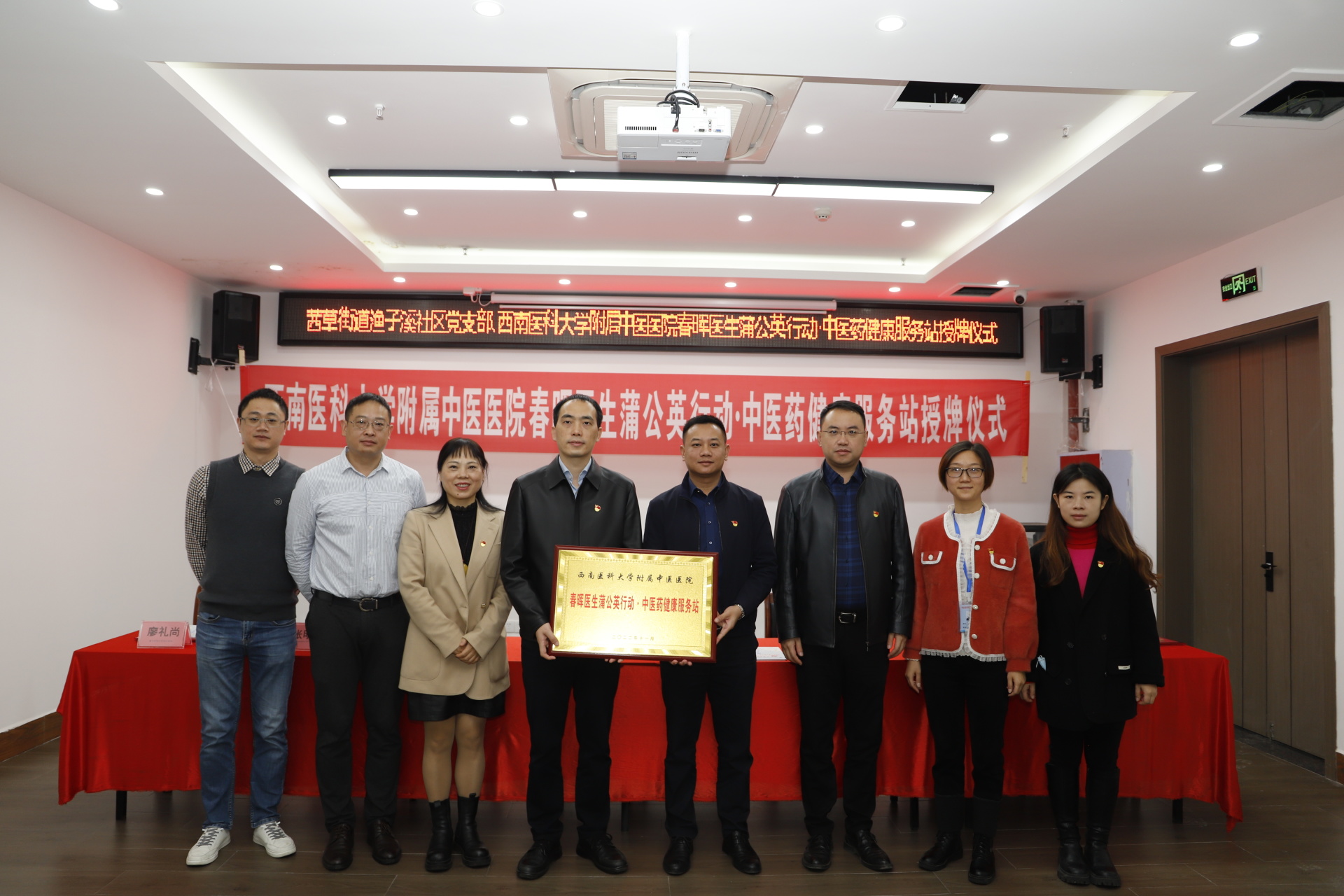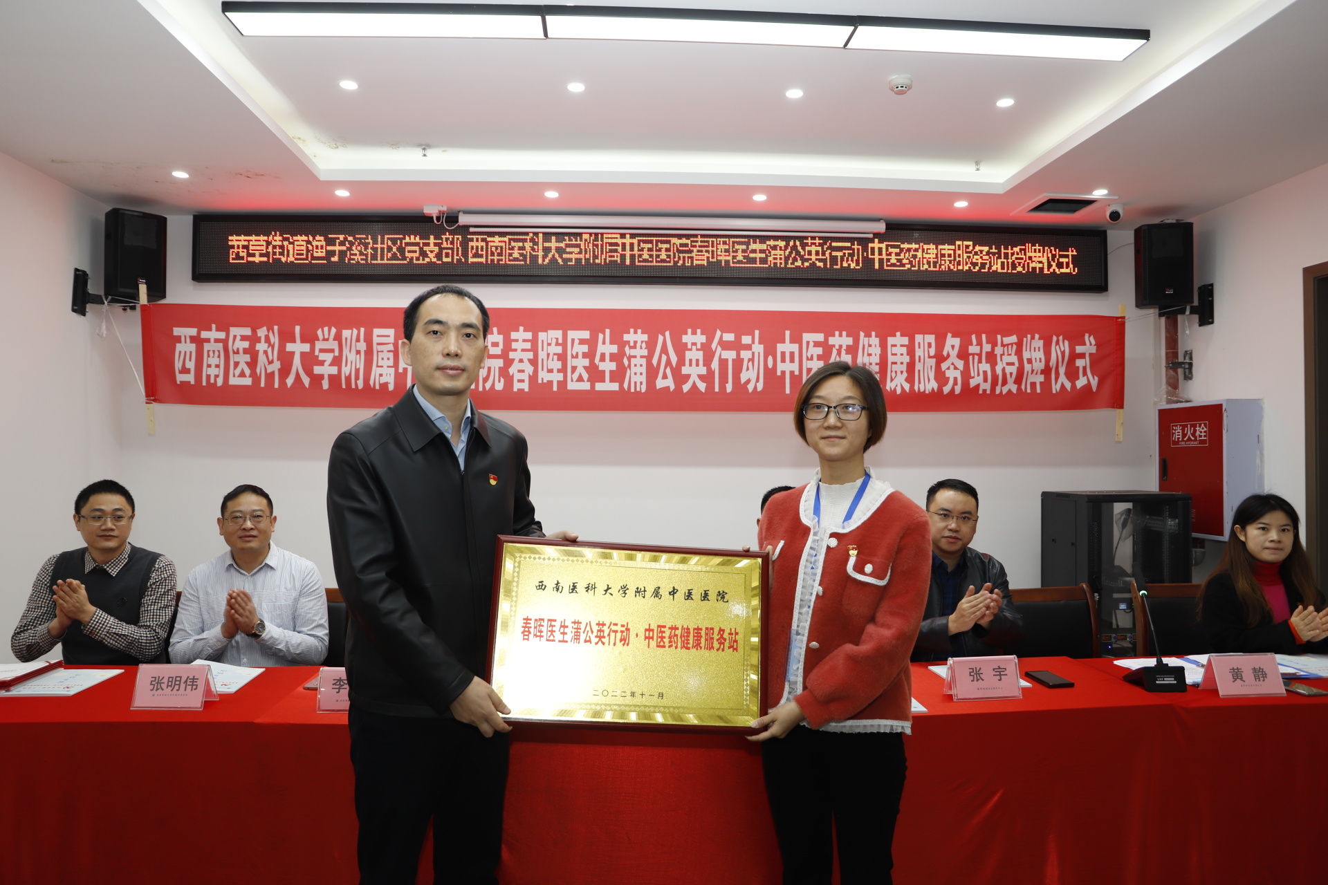 2022年11月16日,我院神经外科党支部、护理感染预防党支部与江阳区茜草街道渔子溪社区党委举行了春晖医生蒲公英行动·中医药健康服务站授牌仪式,我院副院长汪国友,茜草街道党工委副书记、办事处主任甘霖,茜草街道便民服务中心主任张宇,渔子溪社区党委书记黄静及我院相关党支部党员及社区居民等参加了仪式。