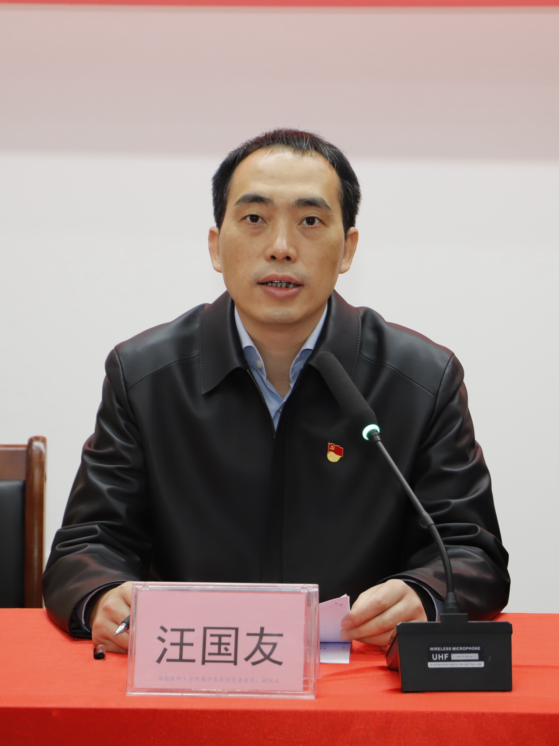 汪国友讲话,他介绍了医院基本情况和春晖医生蒲公英行动·中医药健康服务站的建设背景,希望相关党支部以“弘扬中医药文化,播撒健康的种子”为主题,搭好一个平台,建好两支队伍,做好“六化”工作;同时要以此次授牌为契机,踔厉奋发,勇毅前行,自觉把思想和行动统一到党的二十大精神上来;传承精华,守正创新,充分发挥中医药特色优势;深入群众,深入基层,全心全意为人民服务,为茜草街道渔子溪社区人民群众的身体健康和生命安全保驾护航。