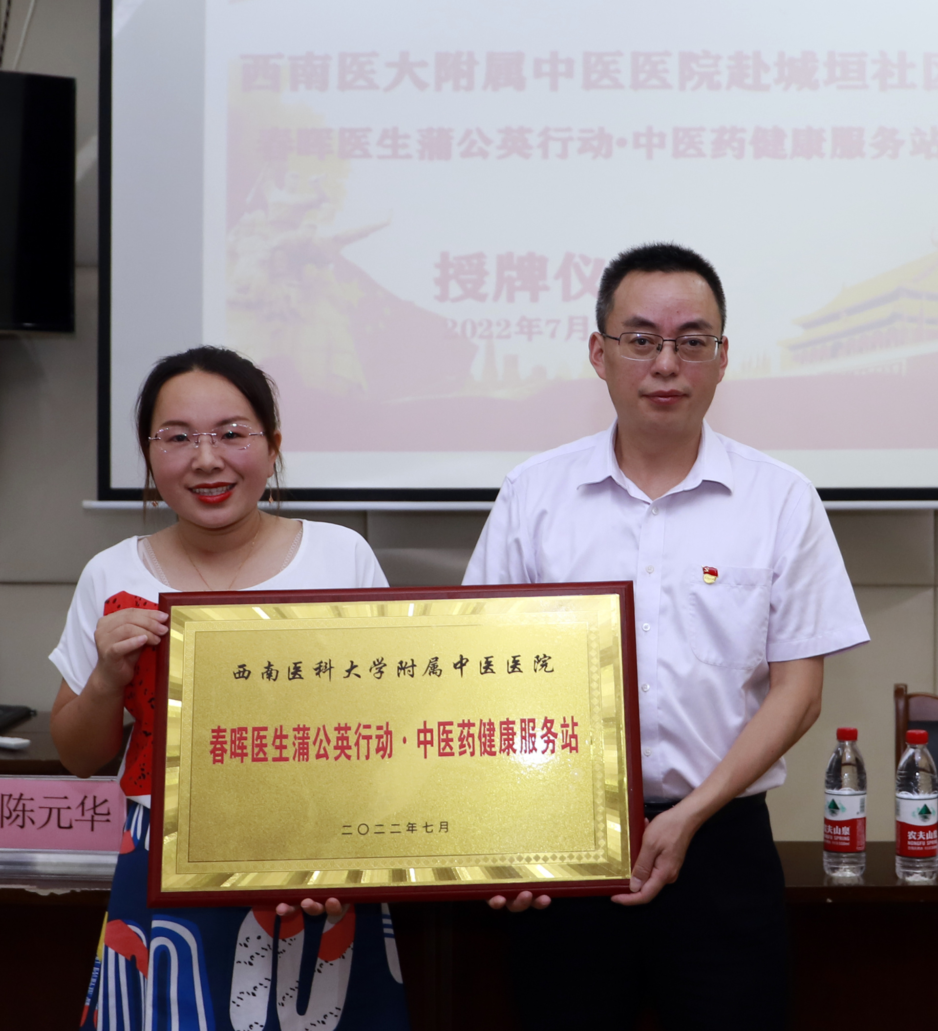 2022年7月26日,我院检验科党支部、全科医学科·VIP病房党支部与泸州市城垣社区党委举行了春晖医生蒲公英行动·中医药健康服务站授牌仪式,医院党委副书记雷学举、城垣社区党委副书记陈元华及相关人员等参加了仪式。