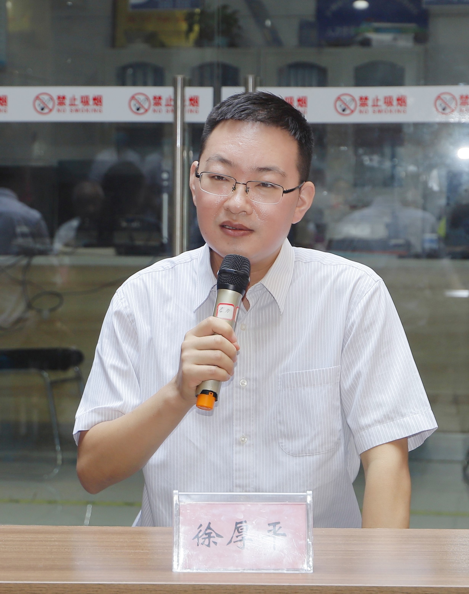 徐厚平讲话,他介绍了医院基本概况和“春晖医生蒲公英行动”开展的背景,希望通过此次与社区共建春晖医生蒲公英行动·中医药健康服务站,充分发挥医院中医药特色优势,把医院优质的医疗资源带到社区,带到每一位居民身边,为群众生命健康保驾护航。
