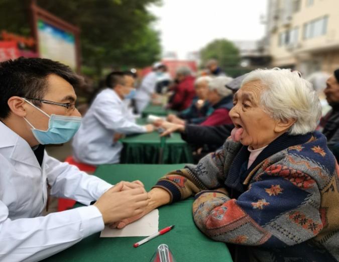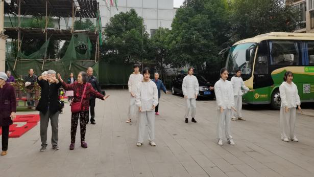 义诊现场,专家们为前来咨询的群众免费诊断,发放健康宣传资料,学生科志愿者进行了养生功法教学展示及指导。