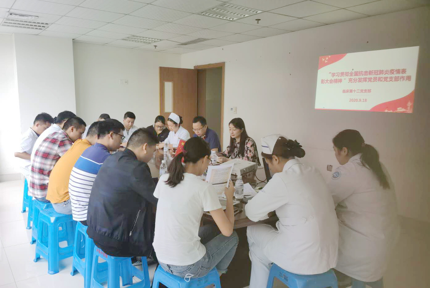 2020年9月18日,我院临床第十二党支部开展了“学习贯彻全国抗击新冠肺炎疫情表彰大会精神 充分发挥党员和党支部作用”主题党日活动。党委副书记·纪委书记徐茜,临床第十二党支部全体党员、预备党员参加了会议。会议由支部书记郭伍斌主持。
